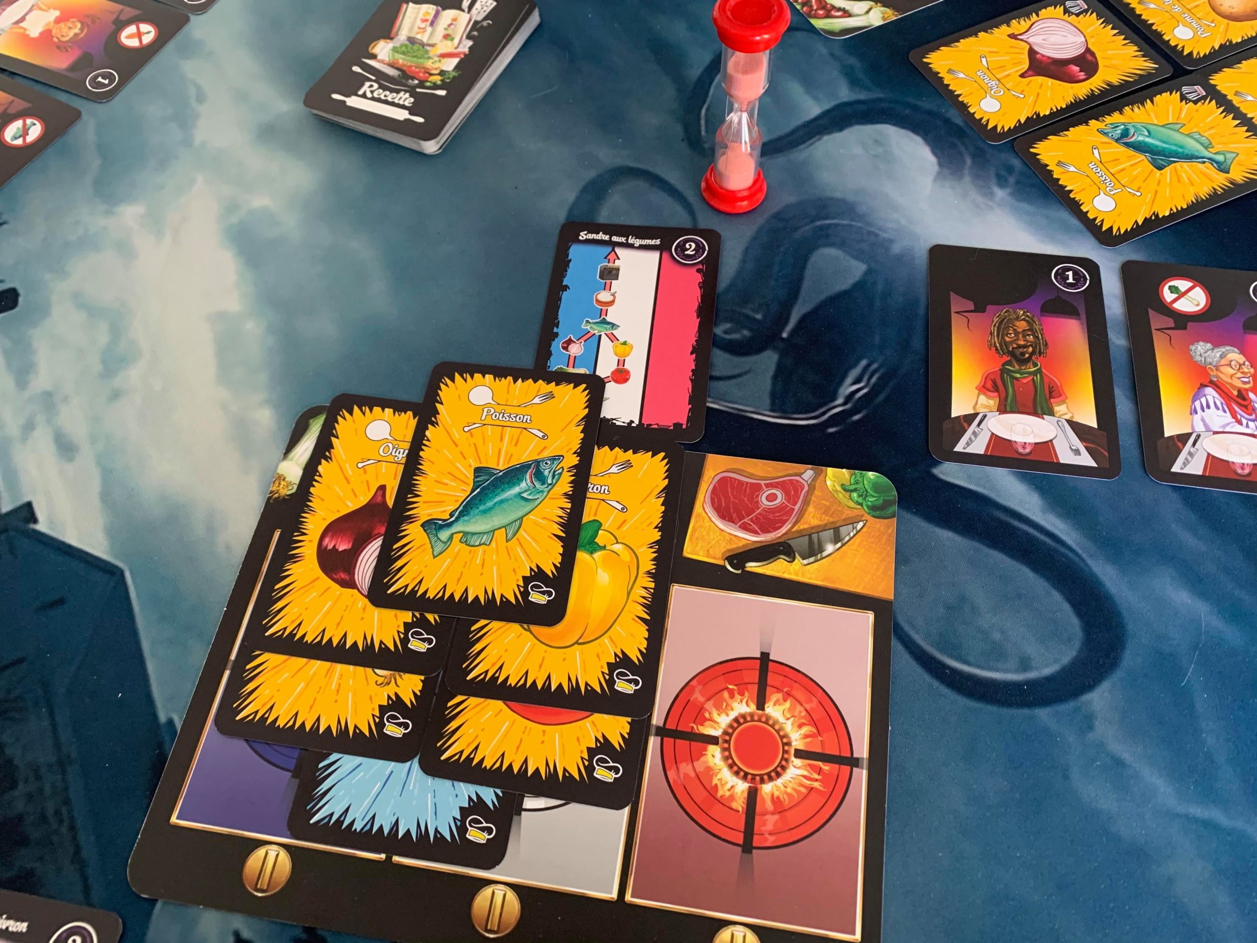 Qu’une brigade se lance pardi ! Eh oui, le lancement de la partie est une sorte de pari pour prendre la main. La première brigade qui pense avoir assez de temps prend le sablier et le retourne et commence à préparer une recette. Jouer en premier est le meilleur moyen pour finir la partie en premier mais attention, si vous n’avez plus de temps c’est une faute professionnelle.