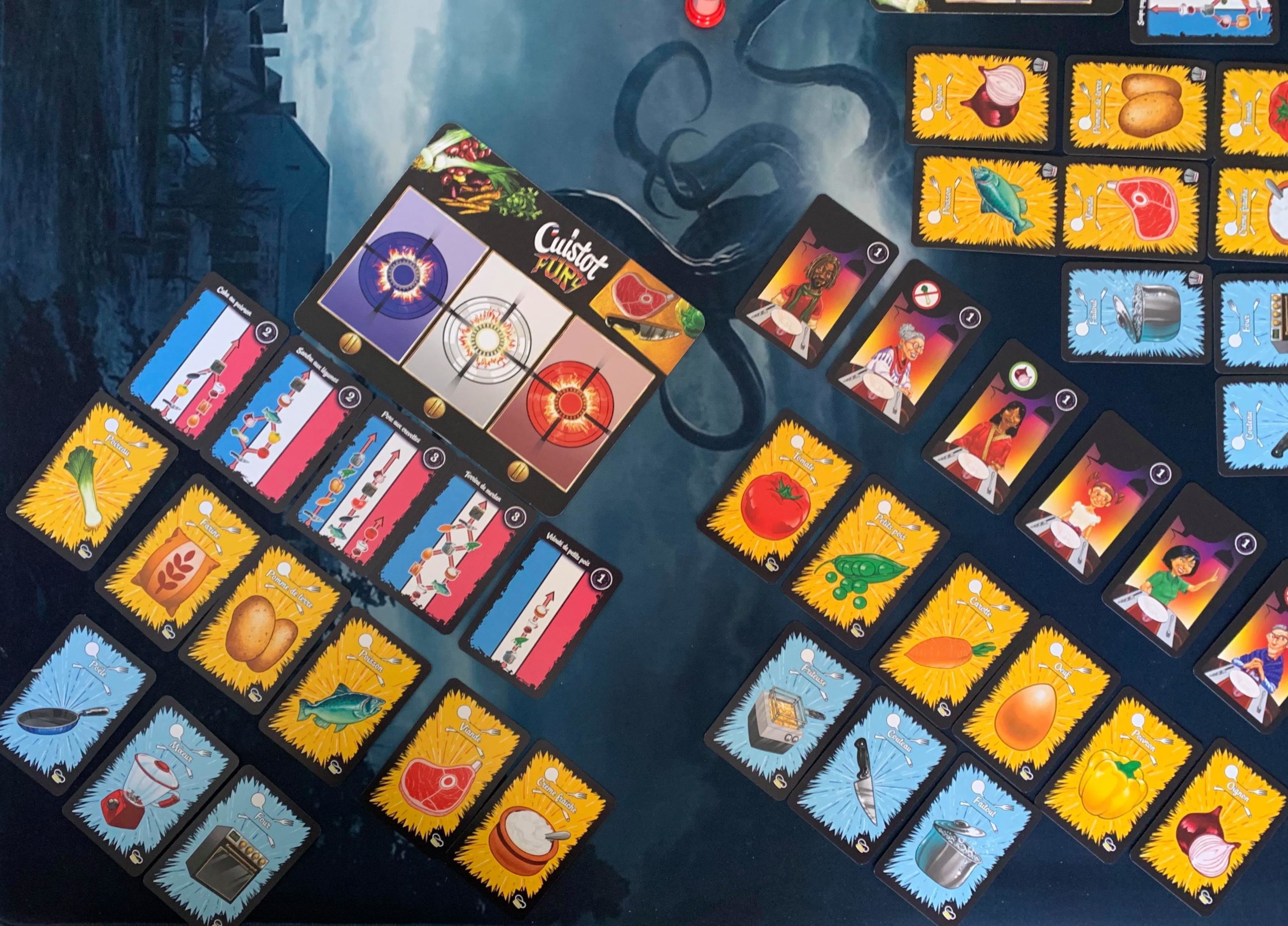 Donc une brigade s’est lancée, elle est composée d’un chef, d’un serveur et d’un commis. Le chef prend une des recettes à sa disposition et place au-dessus de ses fourneaux et s’engage alors un étrange balai où l’équipe doit reproduire le schéma de la carte recette en superposant les cartes d’ingrédients et d’ustensiles comme indiqué. Les membres de la brigade doivent donc coordonner la pose de leurs cartes !