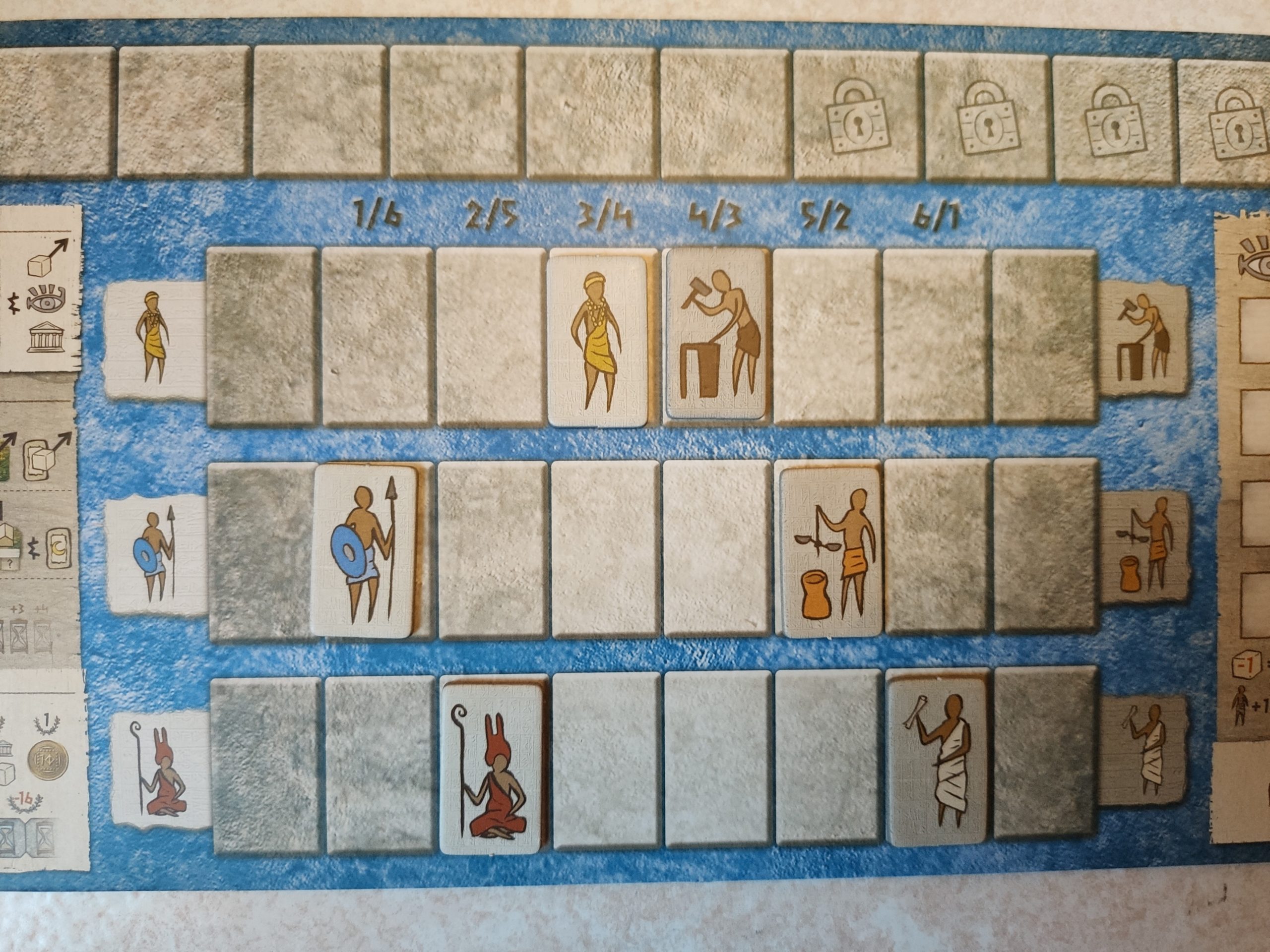 Philosophe: Recruter des citoyens qui vous permettent de jouer des cartes civilisation qui font gagner des PV. Le coût et l’ordre de recrutement est variable et est défini dans une zone du plateau central. Chaque type de citoyen y est présent et est représenté par des tuiles posées à la suite. Lorsqu’un joueur en recrute 1, ce type de citoyen est ensuite remis au bout de la pile, là où le coût de recrutement y est le + élevé. Donc il faut parfois attendre que le « marché » des citoyens soit utilisé par vos adversaires pour que les types que vous souhaitez soient moins coûteux à recruter. Sur votre plateau individuel, vous augmenterez le nombre de vos citoyens en fonction de leur type. Ils sont opposés 2 par 2 ce qui veut dire que si vous faites trop augmenter un type de citoyen, vous devrez au bout d’un moment réduire le nombre du type de citoyen lui faisant face. Voyez cela comme des curseurs qu’il faut ajuster au fur et à mesure. En tout cas c’est une super idée!