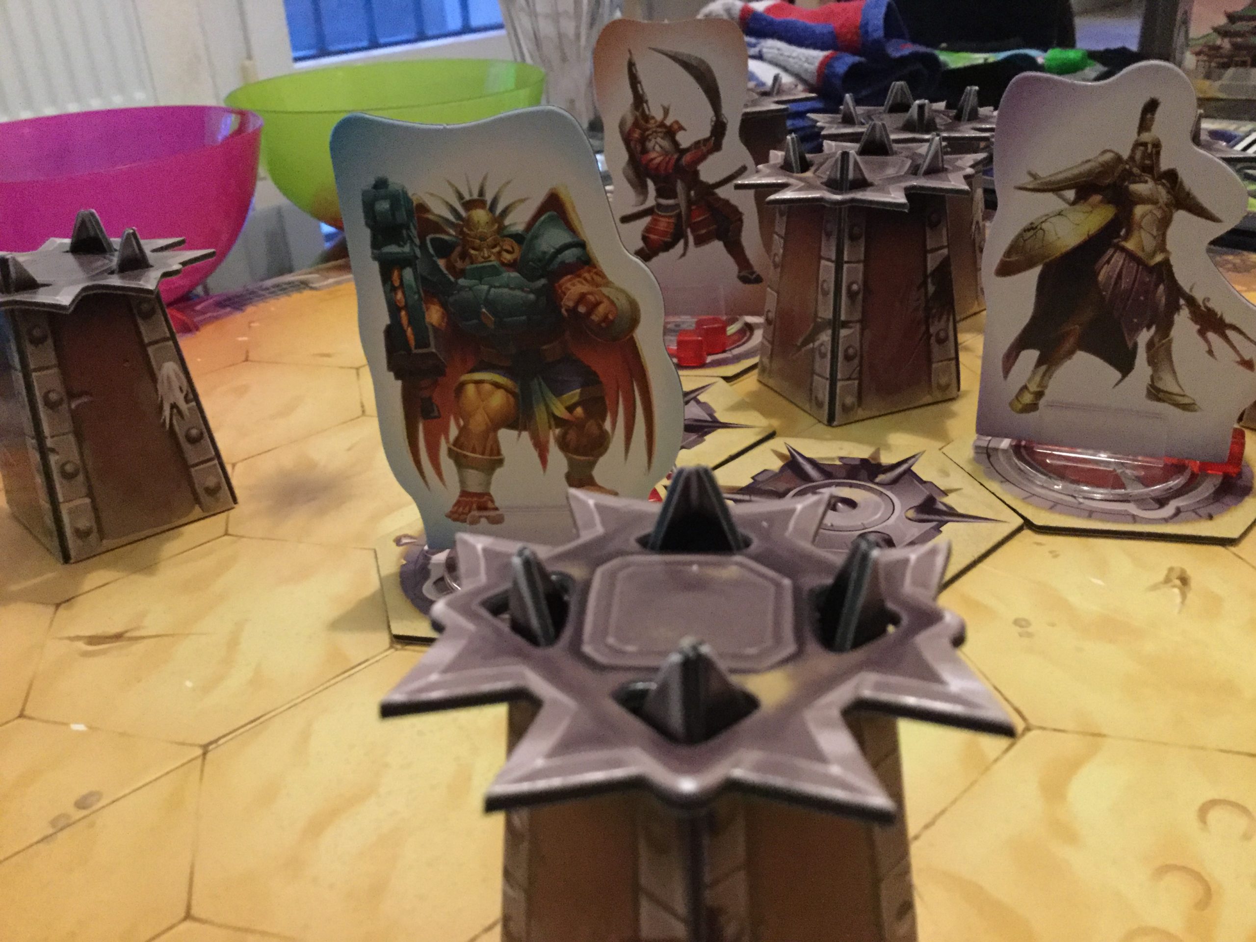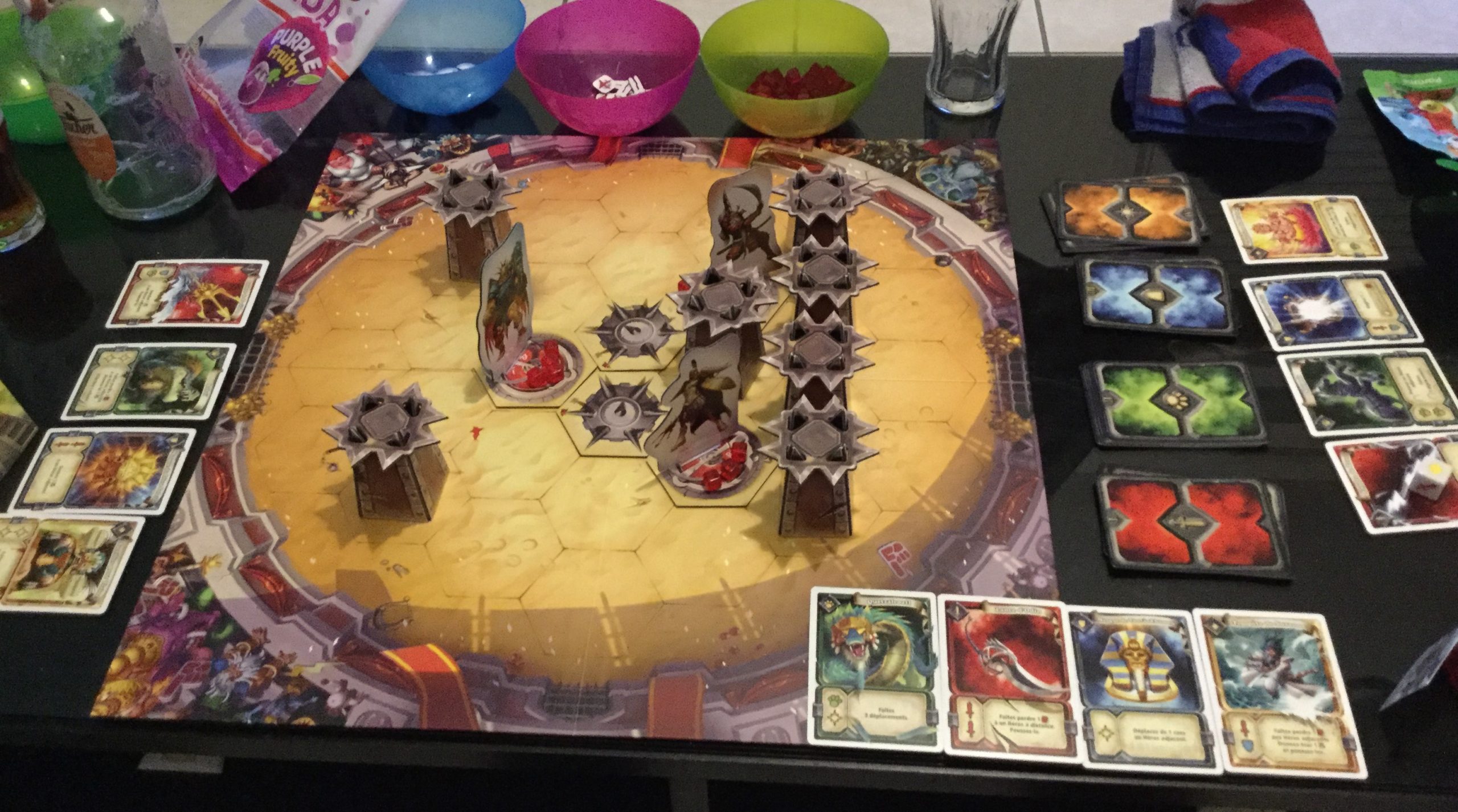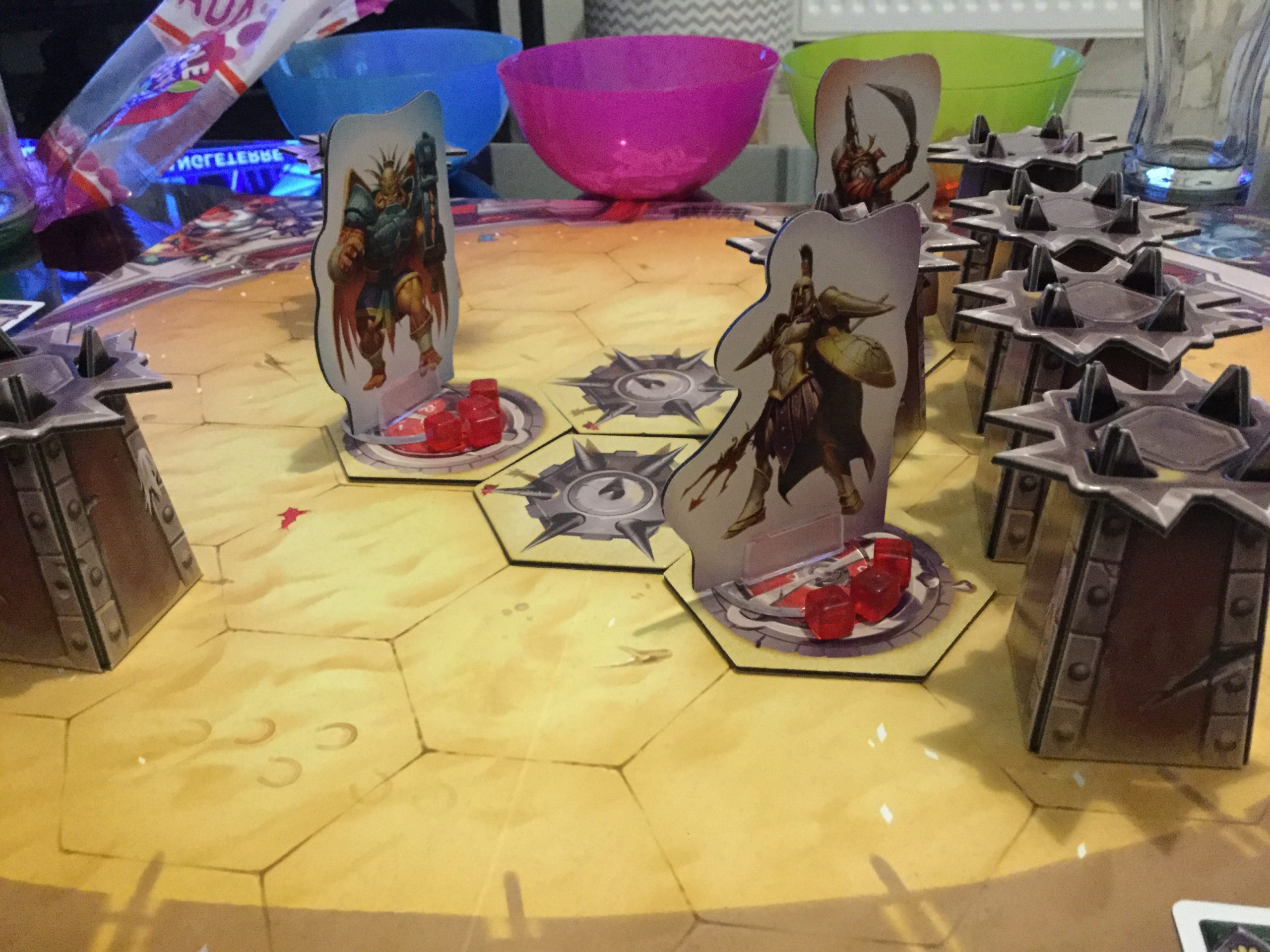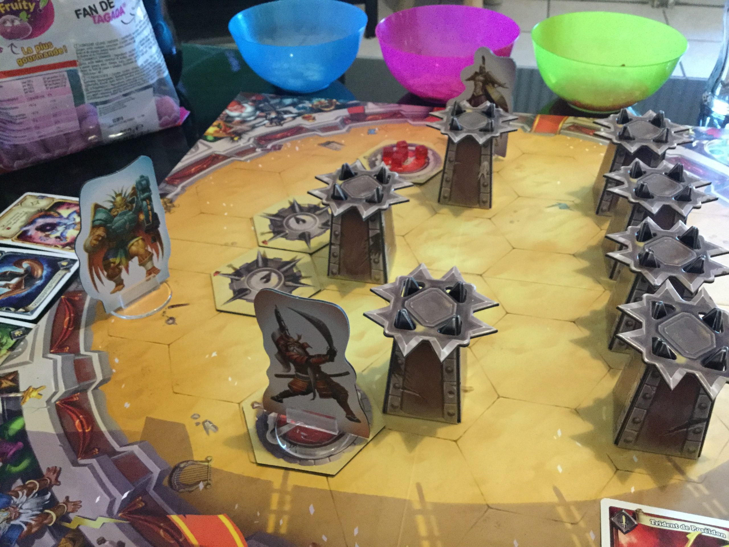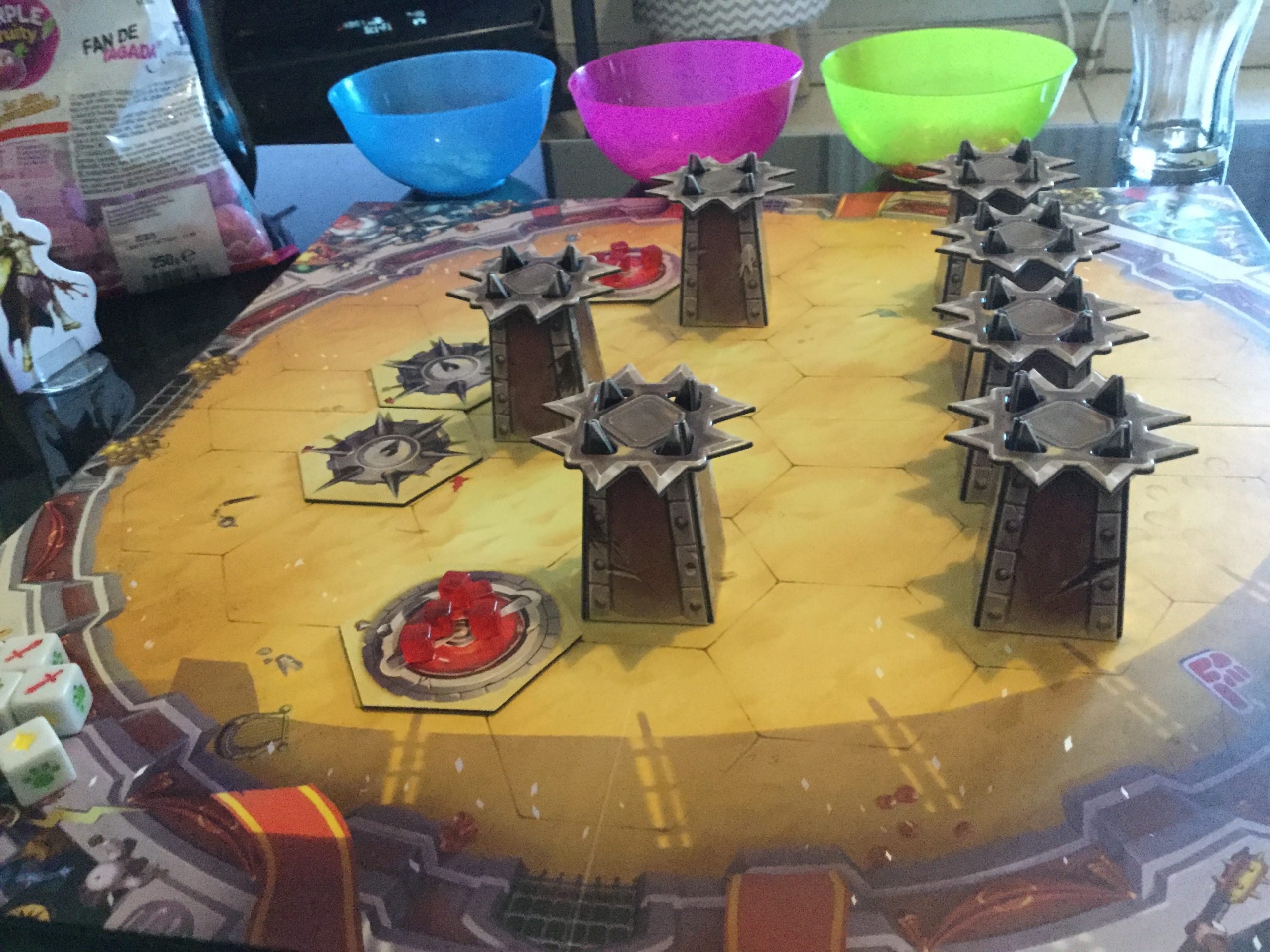 Une fois équipé vous pénétrez dans l’arène. L’arène est composé de cases et en fonction du nombre de joueurs et de la durée souhaitée de la partie, le livre de règles vous montre plusieurs dispositions des éléments dans l’arène. Il y a des fontaines de PV (qui vous redonne 1 PV quand vous allez dessus), des pièges (qui vous enlève 1PV) et des tours hérissés de piques (qui vous font mal quand l’adversaire vous propulse dessus…).