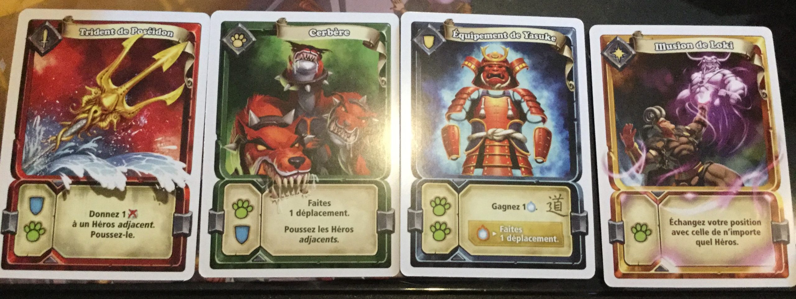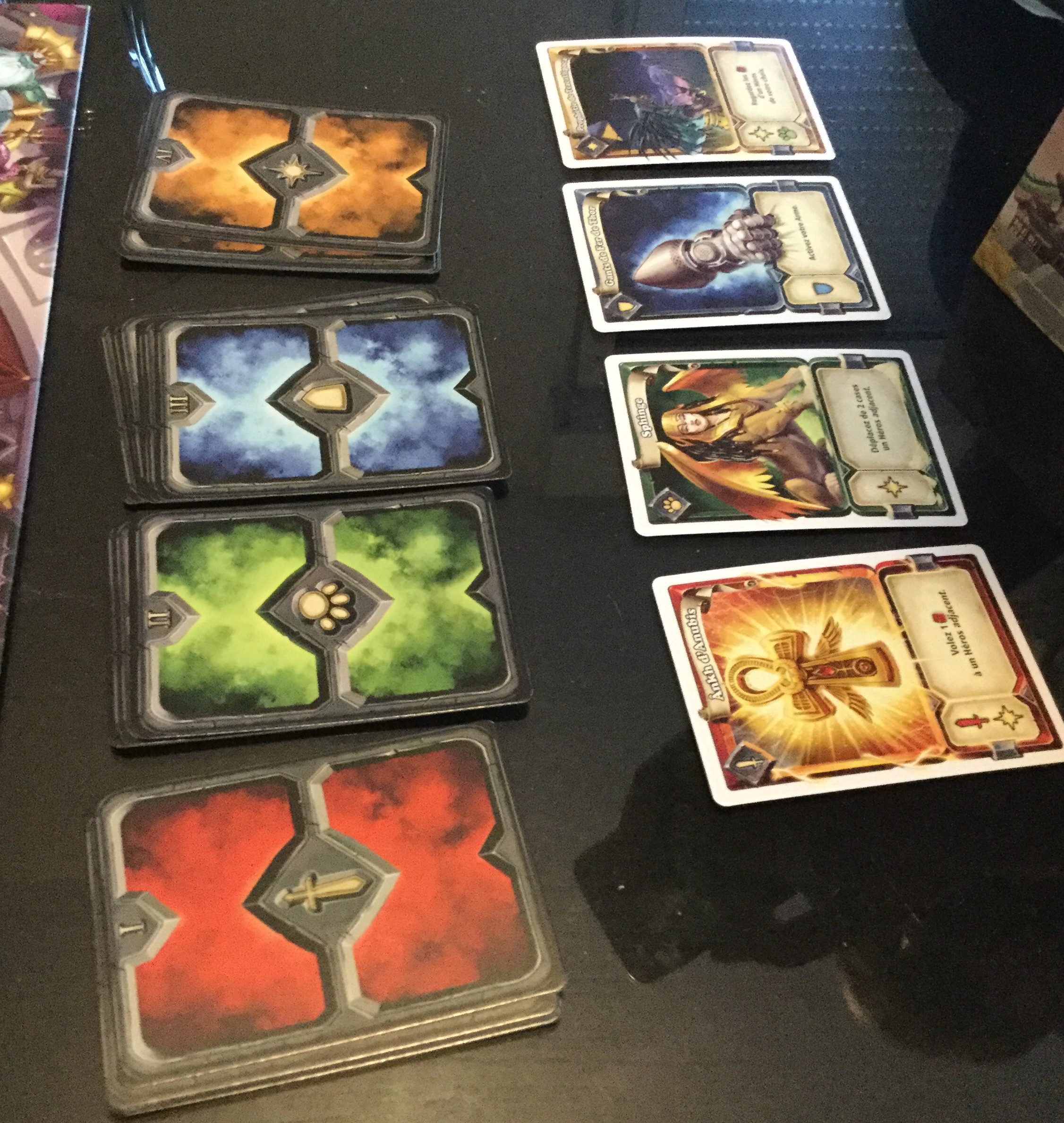 Il existe 4 types d’équipement, les armes, les armures, les montures et la magie. 4 piles de cartes sont formées et on révèle autant de cartes que de joueurs. Le principe est simple, si vous voulez telle carte, il va falloir la payer.