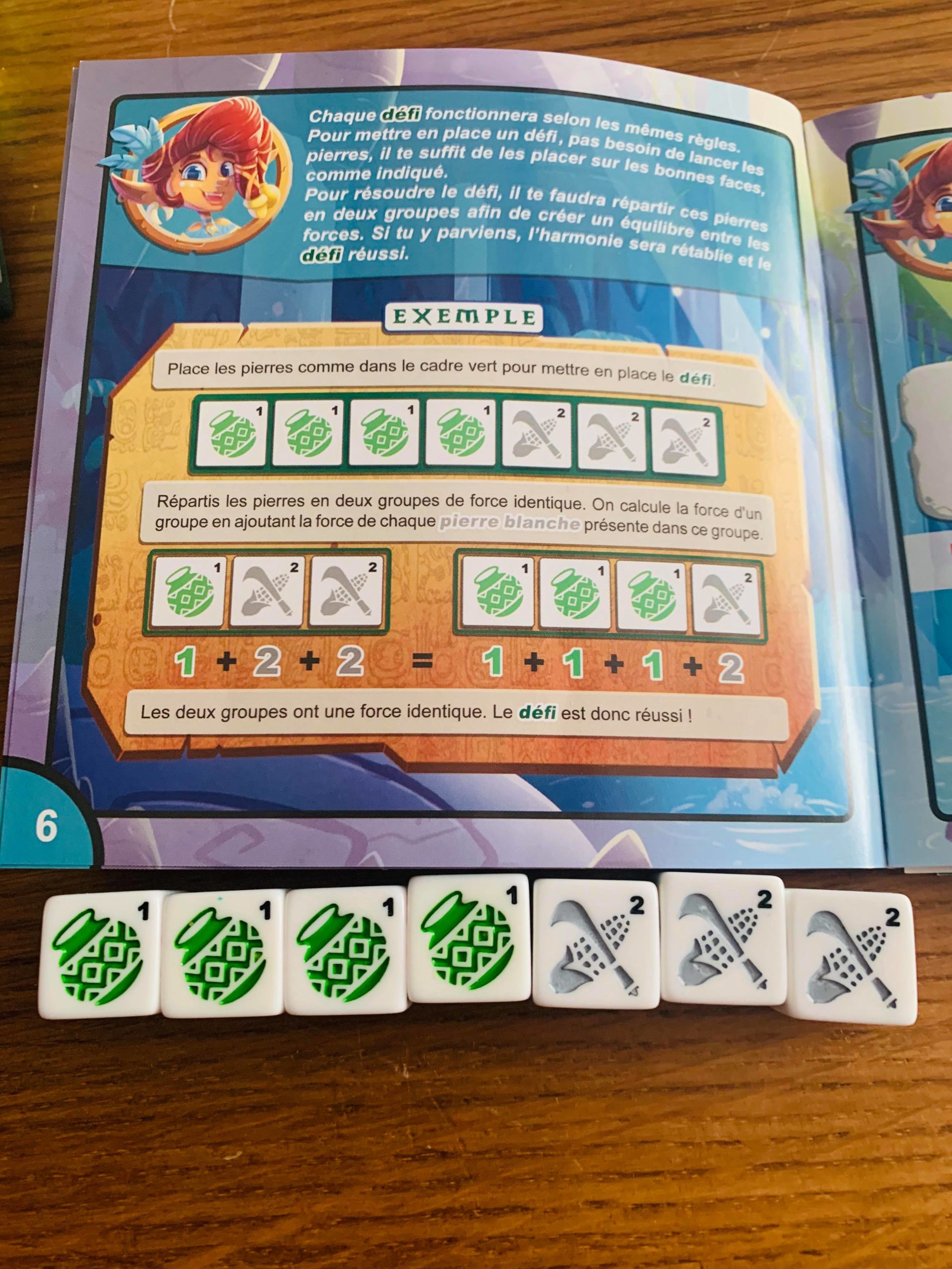Si vous finissez le jeu… vous pouvez l’offrir ? Ou alors à plusieurs l’auteur a pensé à un défi : lancez les dés et le premier joueur qui trouve une solution… est bien plus malin que les autres !