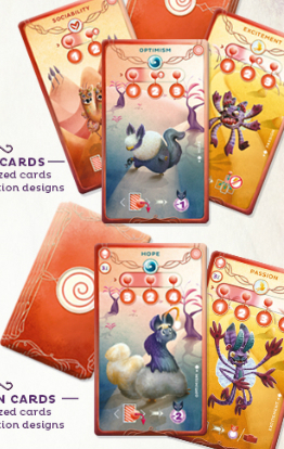 Alors autant vous le dire, ce jeu ne s’adresse pas à tout le monde. Je me suis farci les règles (en anglais bien sûr la version française est pas encore dispo) et c’est velu comme j’aime à dire. Pour mon bonheur je ne peux même pas m’appuyer sur d’autres chroniques sur ce jeu puisque la page Kickstarter mentionne joyeusement qu’elles arriveront très très vite… 😉 Donc je fais mes devoirs consciencieusement et je découvre un gameplay bien profond et plutôt bien foutu. Il y est question de faire évoluer nos cartes émotions (un peu comme des Pokemon pour ceux à qui ça parle mieux) pour les rendre plus fortes. Là où c’est fort c’est que l’émotion de base Optimisme deviendra Espoir une fois transformée (une carte est prévue pour chaque évolution), la Peur deviendra la Panique et ainsi de suite pour tout le spectre des émotions. Franchement chapeau la thématique est très bien respectée et développée, ça promet!!!