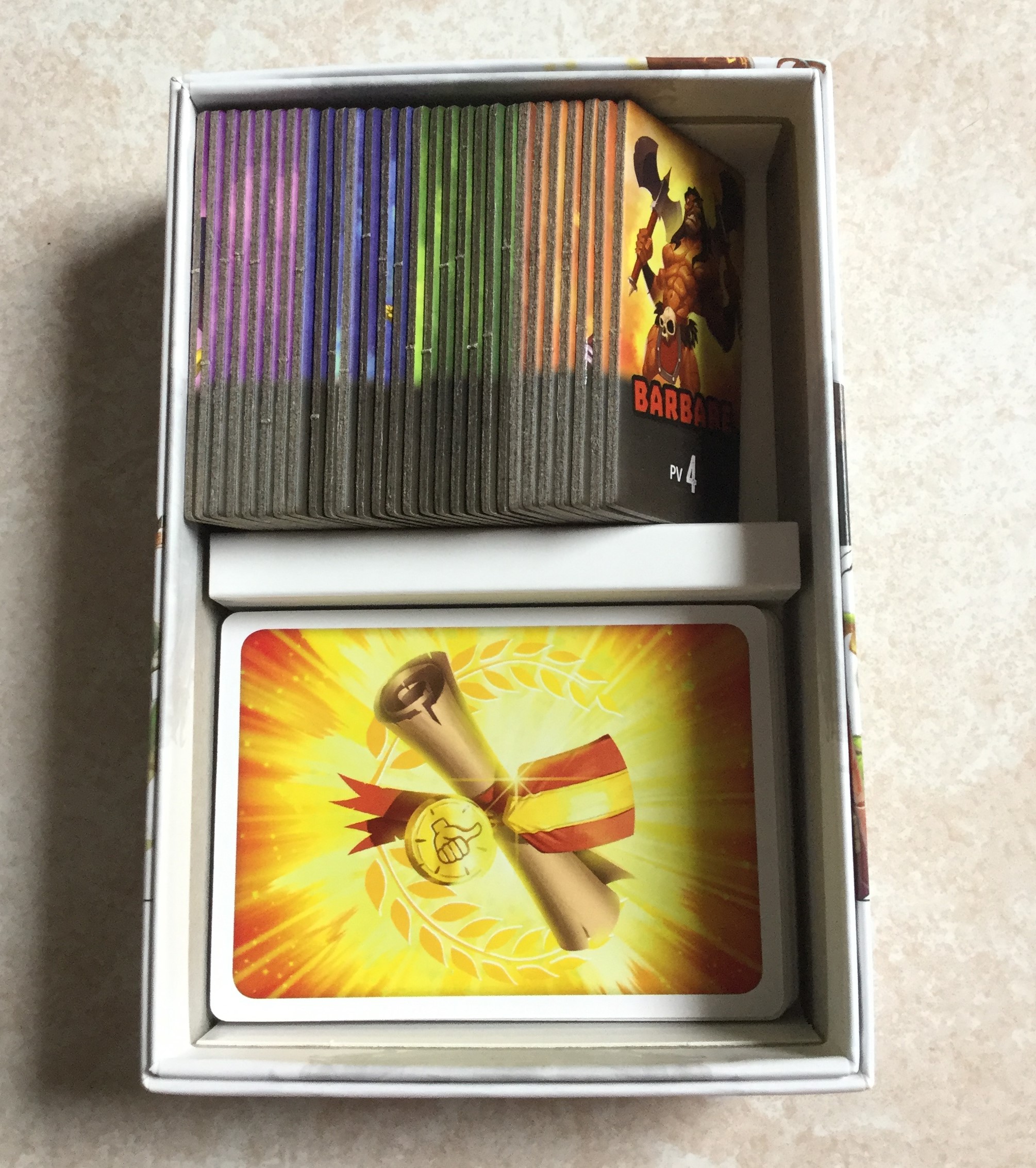 Mais mon éthique journalistique était la plus forte, alors j’ai passé outre cet étalage vraiment répugnant de guimauve et d’illustrations toutes mignonnes, qui ne sont pas sans faire penser aux jeux mobiles à la Clash of Kings, pour tenter de m’intéresser au gameplay. J’espère que vous êtes impressionnés. Ce qui saute aux yeux, c’est qu’on est clairement dans la même mouvance qu’Architectes d’Amytis, Garden Rush, Zenith, Gatsby et autres jeux sortis récemment : les règles s’appliquent en quelques minutes, la mise en place est ultra rapide, une partie ne prend pas plus de 20 minutes, et appelle presque toujours une revanche. Autre point commun, vous l’avez deviné, il se joue à 2 lui aussi, bravo on ne peut vraiment rien vous cacher. Enfin, et c’est quelque chose qui me tient à cœur, ici aussi on a entre les mains une boite petite et bien remplie, sans perte de place, avec du matériel de qualité. J’aime beaucoup cette tendance.