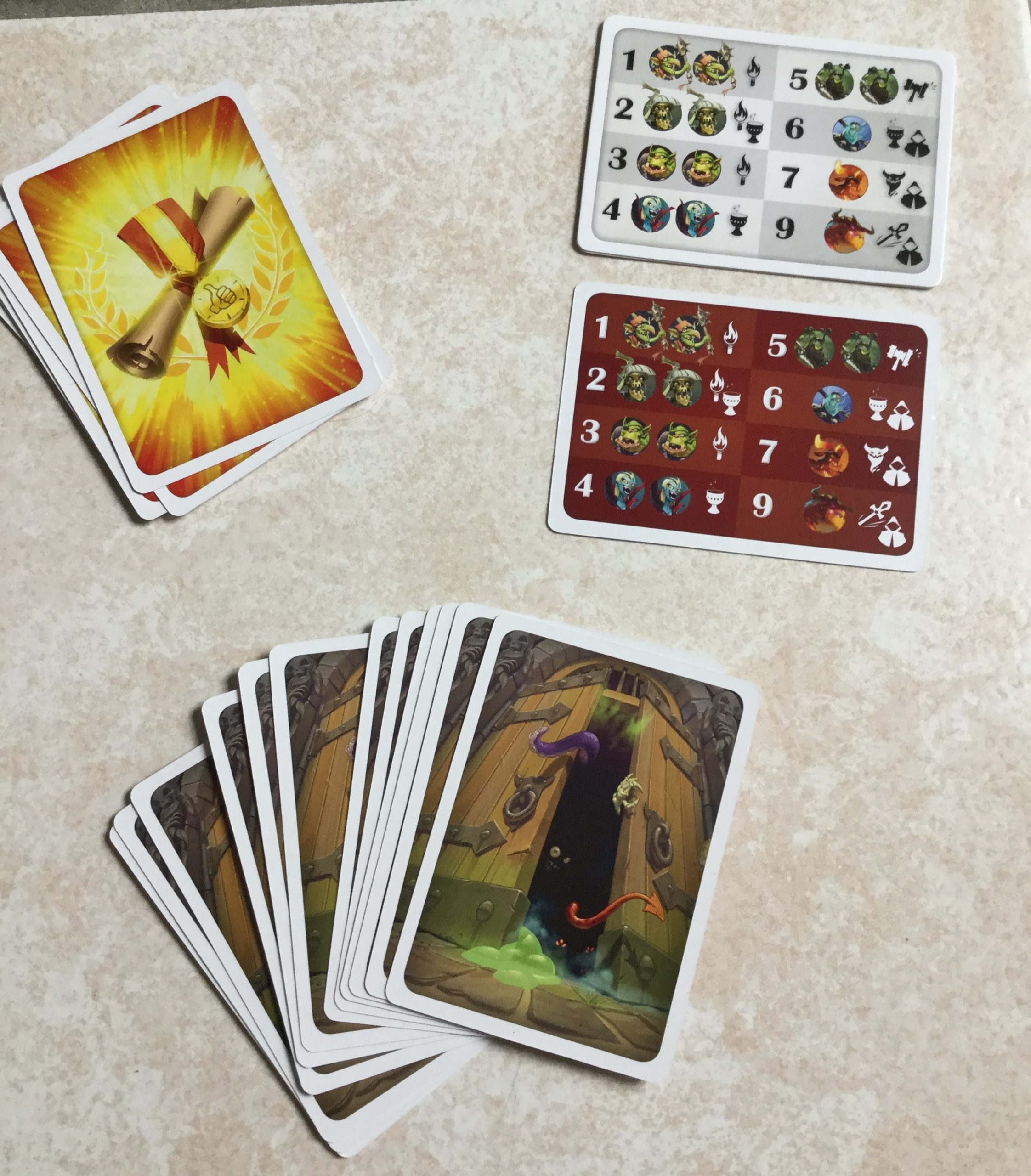 Un joueur pourra enfin choisir de passer son tour. Le dernier joueur à ne pas avoir passé pénétrera dans le donjon pour affronter la pile de monstres que les joueurs auront ajoutés. On révèle les cartes une à une, et en fonction des équipements qu’il reste, et des points de vie du héros, on voit si ce dernier arriver au bout du donjon!