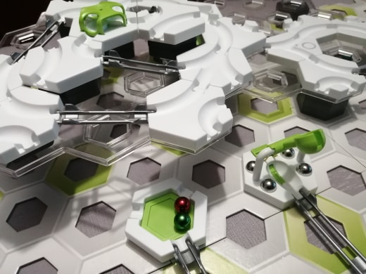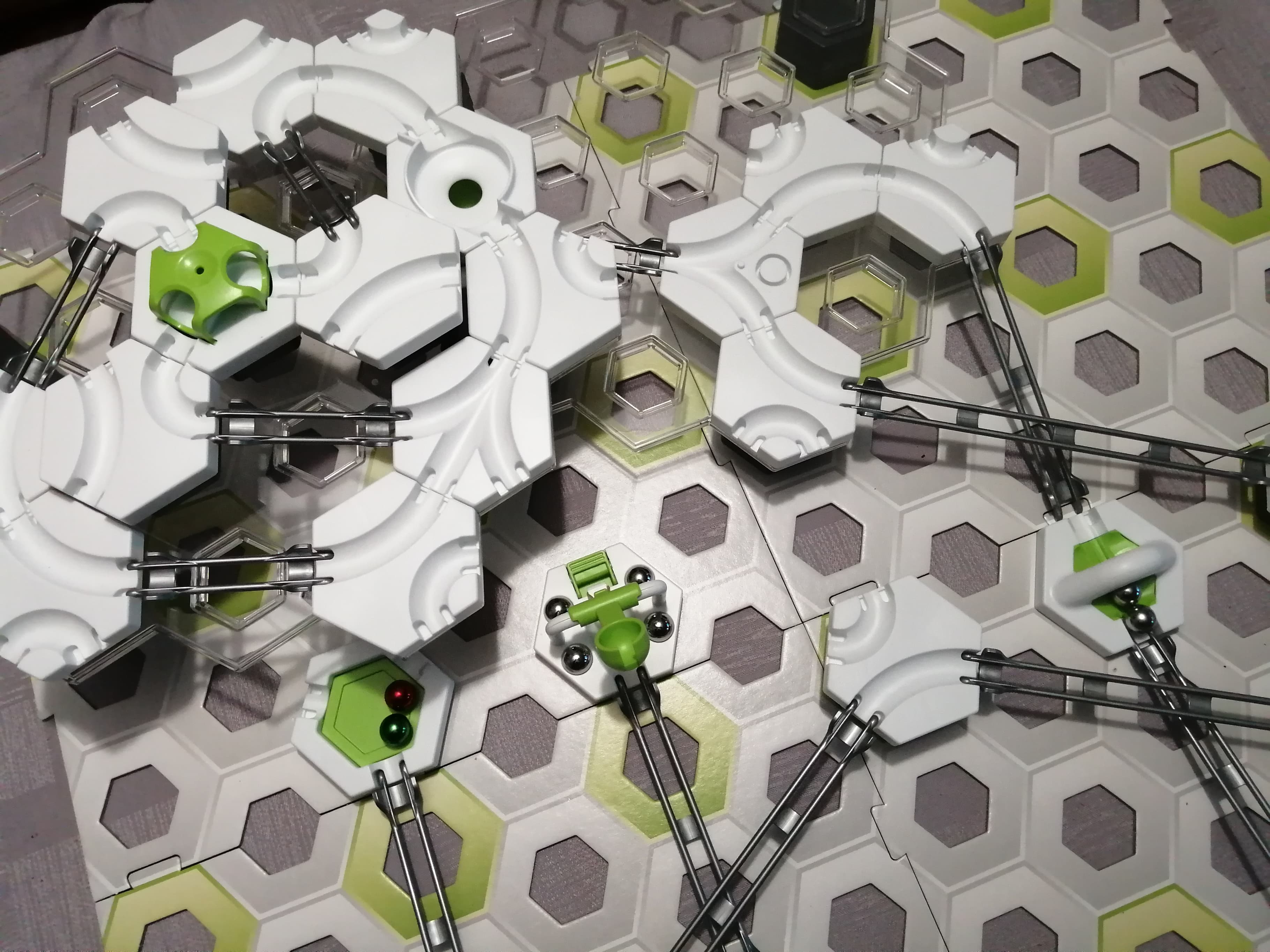 Des plateaux en carton épais à dépuncher, des éléments en plastiques comme des socles, des rails ou des plateformes, le joueur de jeux de société n’est pas dépaysé par le matériel, somme toute et il faut le souligner, de très bonne facture, comparé à d’autres circuits de billes existants sur le marché.l