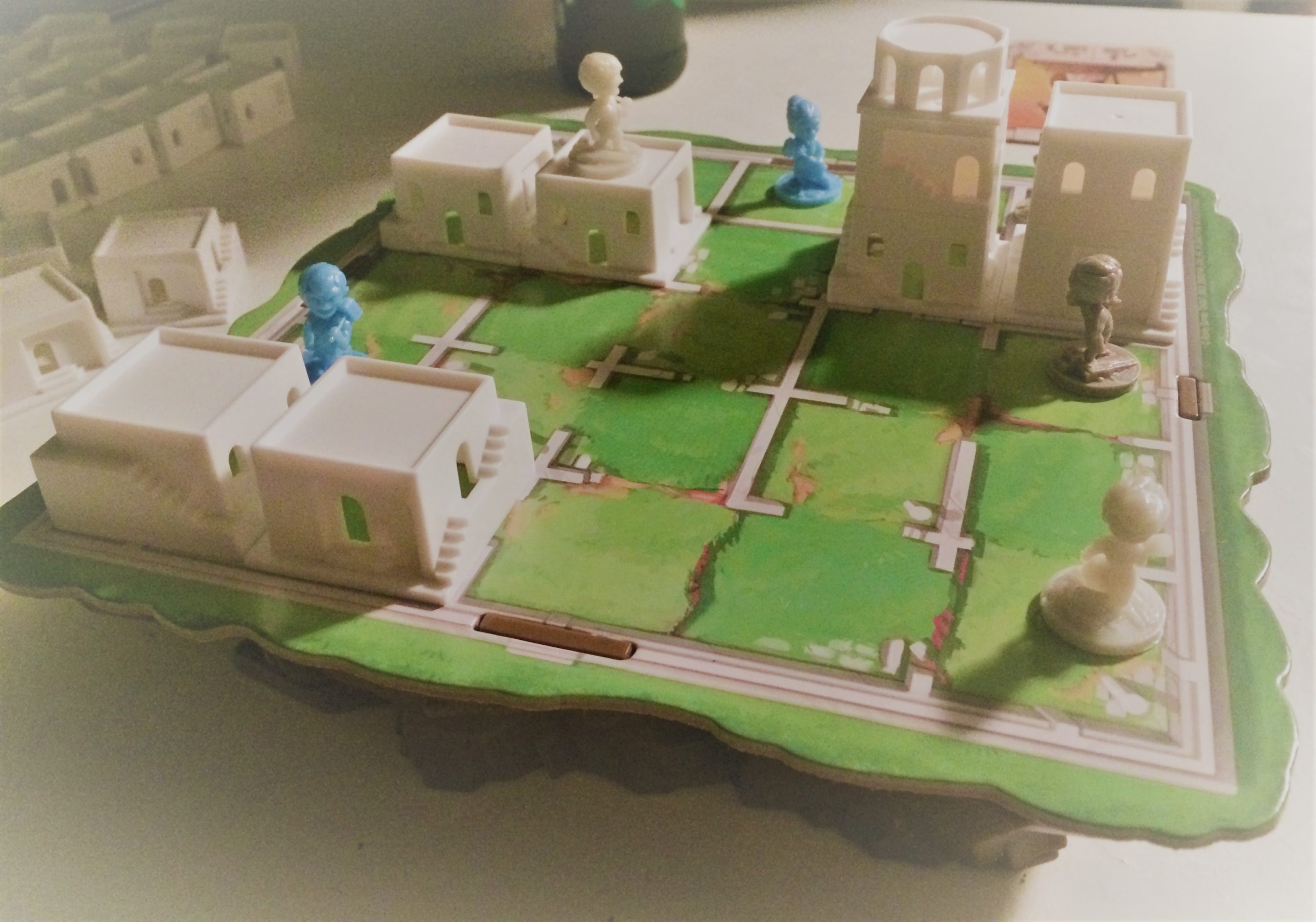 Chaque joueur dispose de 2 architectes qu’il devra déplacer sur le plateau pour construire les maisons sur une case adjacente. En commençant par le rez-de-chaussée, le 1er étage, le 2ème et enfin le dôme bleu (qui termine la construction d’un bâtiment).