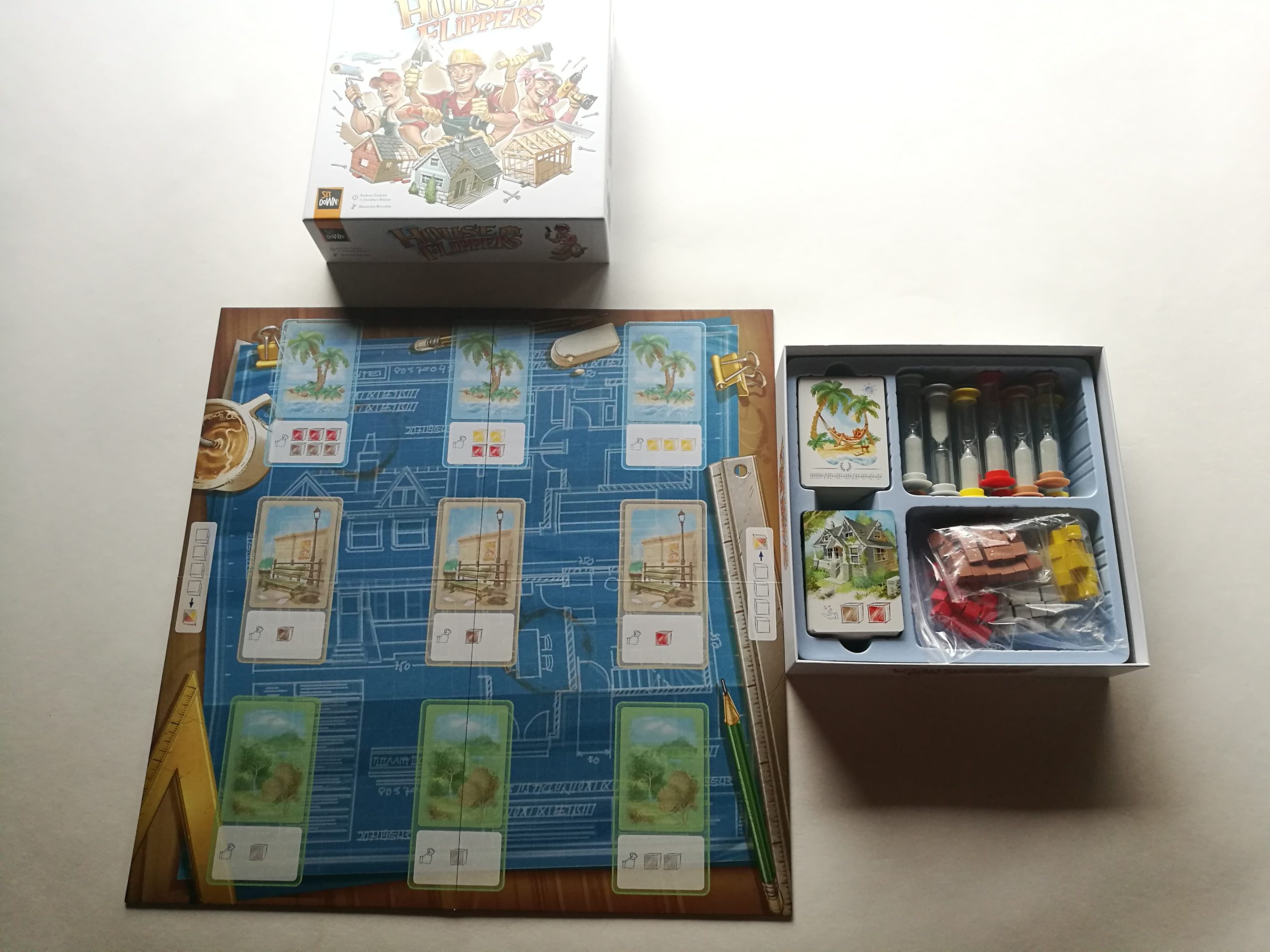 Housse Flippers est un jeu de dextérité, de rapidité où aucun tour de jeu n’est effectué, tous les joueurs jouent en simultané et doivent être rapides et observateurs pour s’emparer des biens qu’ils convoitent, les rénover et investir leurs ressources pour se préparer à se faire dorer au soleil, le tout en moins de 10 minutes !