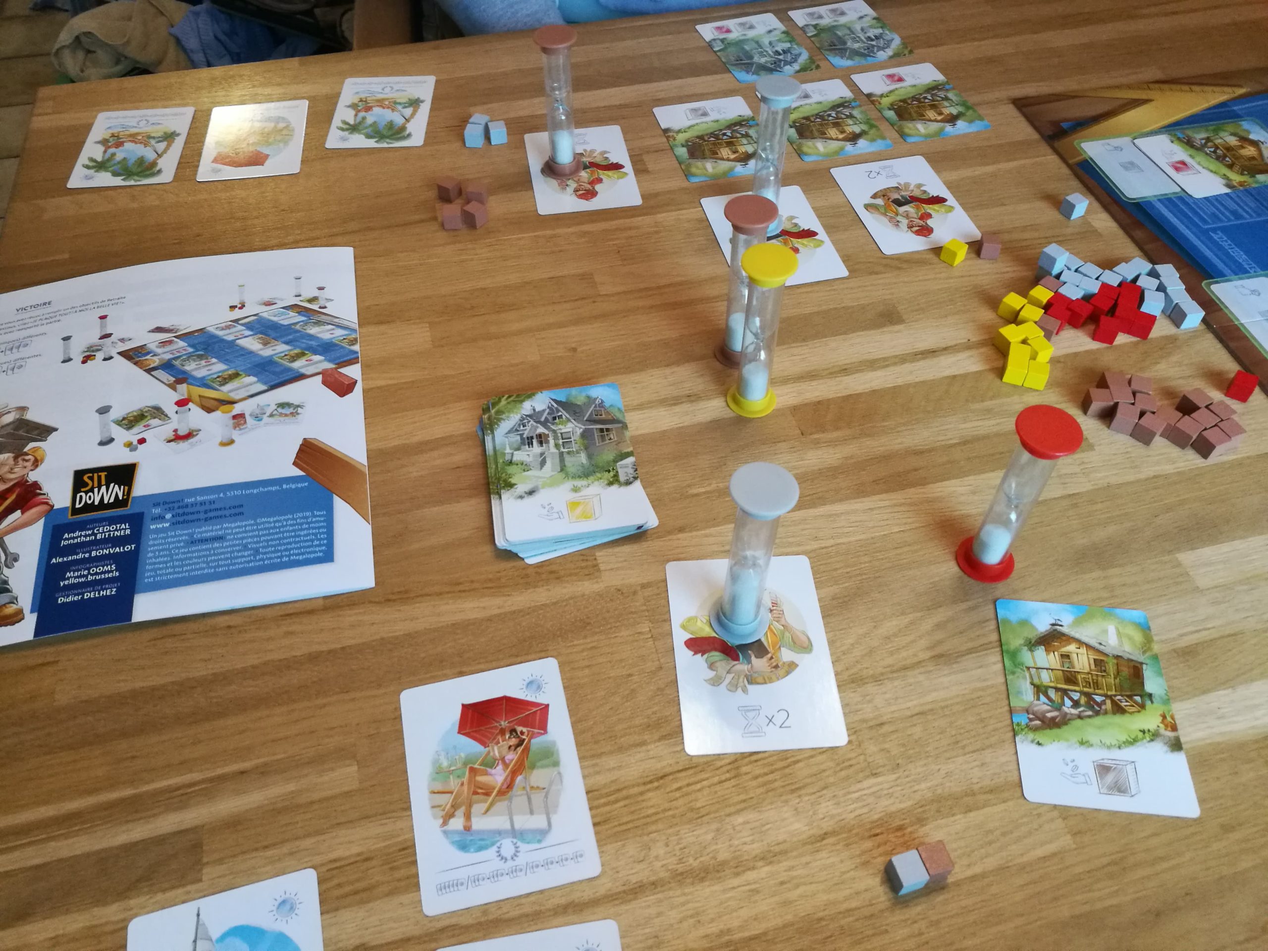 Une fois la mise en place effectuée (limpide comme mise en place, il suffit de répartir les cartes sur les emplacements correspondants et de répartir les sabliers et les ressources aléatoirement et équitablement).