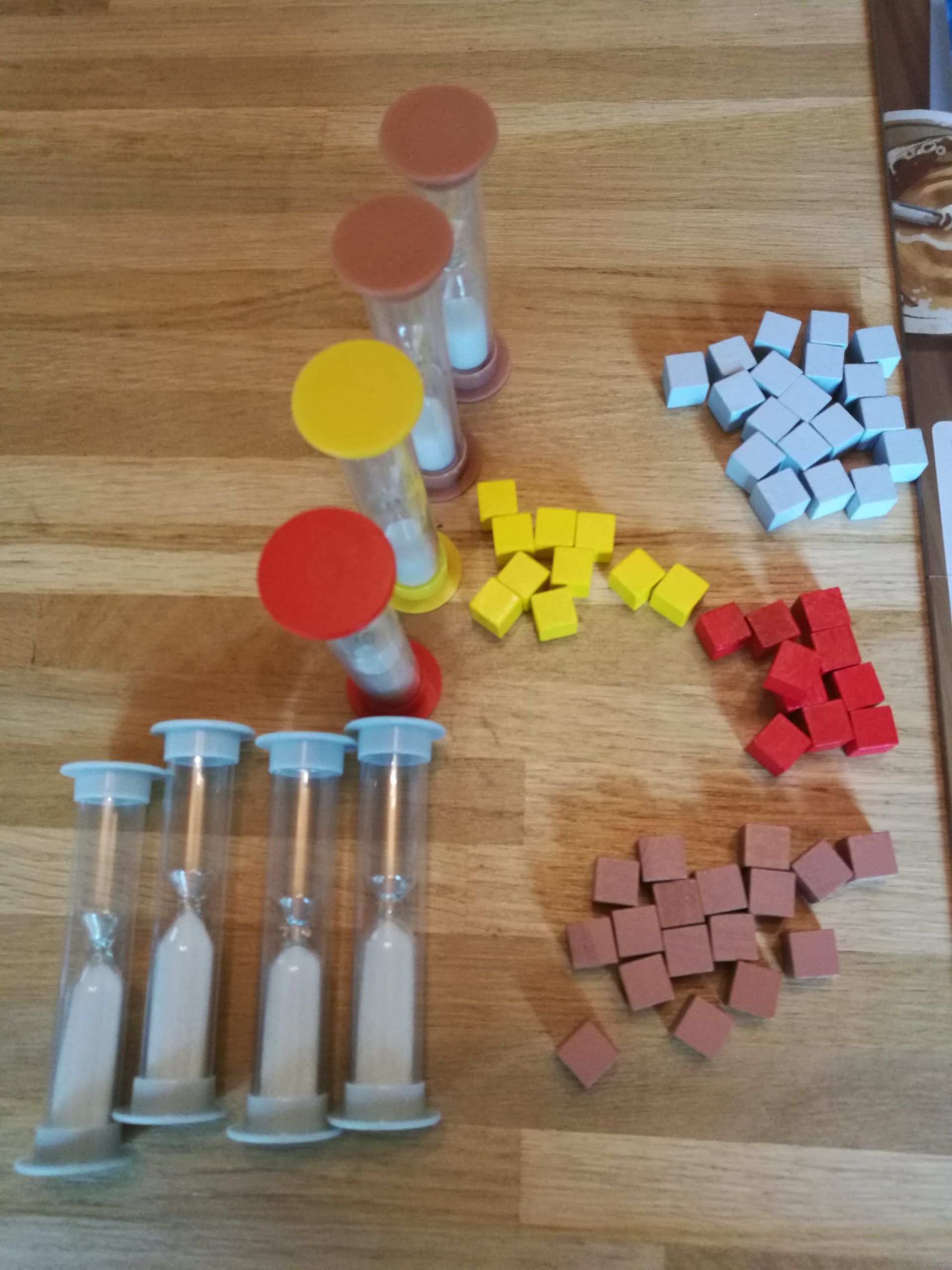 Chaque joueur prend un sablier gris aléatoirement aussi (oui car certains ont plus de « sable » que d’autres, donc certains joueurs vont commencer avec un handicap).