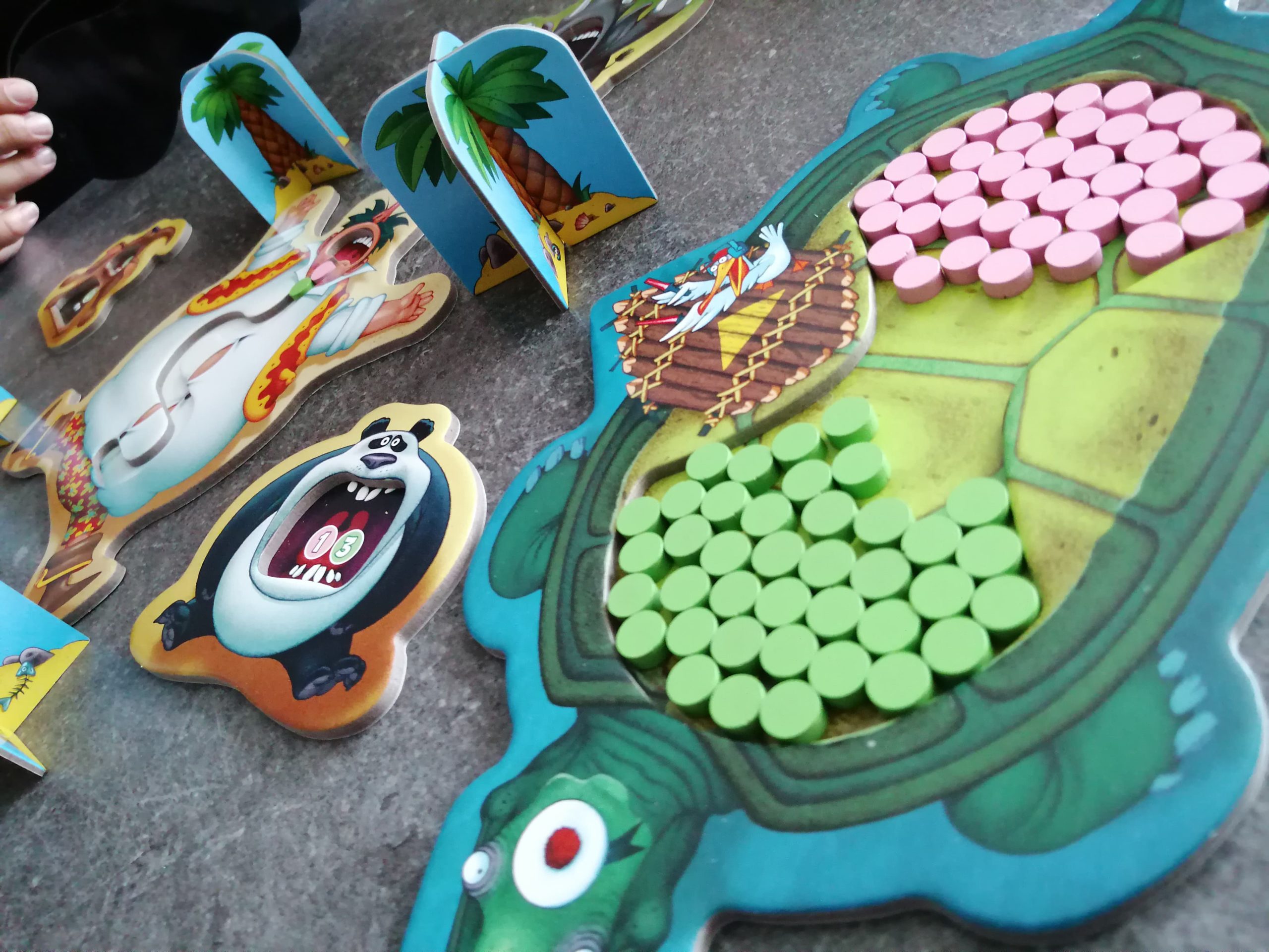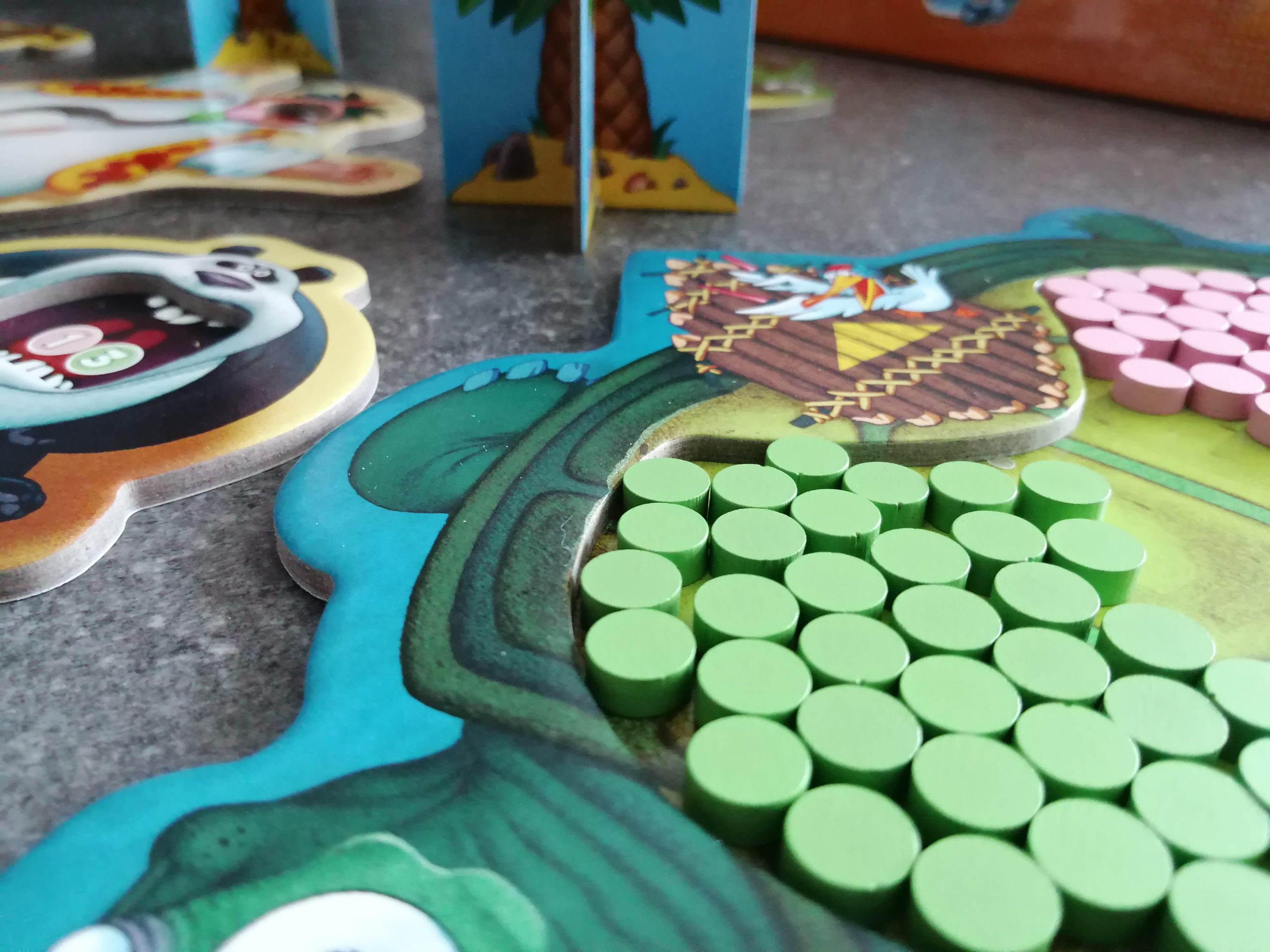 Après avoir installé le géant avec autour de lui 6 animaux et les arbres, on prépare notre base de lancement sous la forme d’une tortue géante surement inspirée de celles qui traînent dans les îles Galapagos, remplie des 70 jetons.