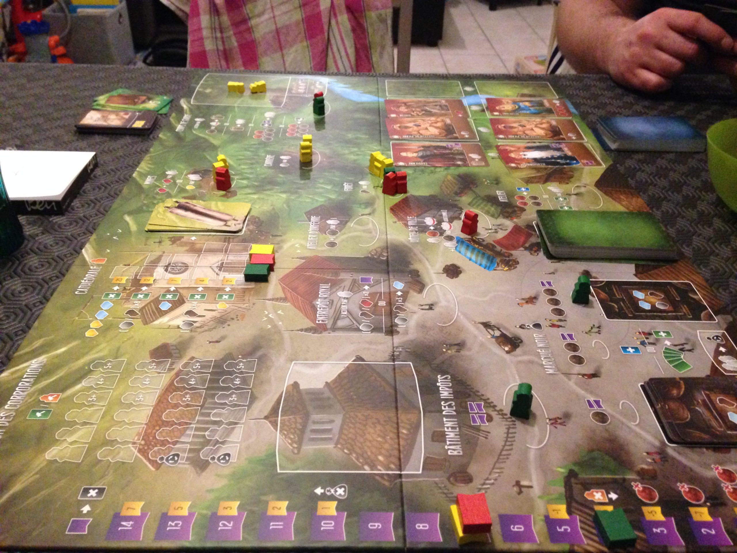 On se retrouve donc avec un plateau central composé de différents lieux sur lesquels on va pouvoir placer nos ouvriers, acquérir des cartes plans de bâtiments, des cartes apprentis, et des ressources.
