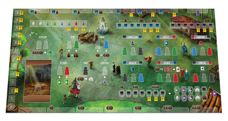 Sur le côté gauche du plateau individuel, on trouve les actions de ressources et de construction. A droite, les actions pour scorer ou améliorer les attributs. A chaque fois qu’un joueur voudra réaliser une action, il va devoir s’acquitter du coût en ouvriers (nombre et couleurs différents selon les actions) et des pièces.Ses pistes de foi, force et influence pourront rentrer en ligne de compte et un certain niveau dans une de ses pistes pourra être requis.