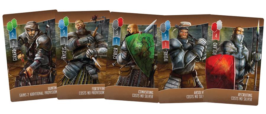 Les joueurs vont avoir un plateau individuel, un set de cartes paladins, et des ouvriers parmi les différentes couleurs et fonctions (fermiers/blancs, éclaireurs/verts, marchands/bleus, combattants/rouges, clercs/gris et criminels/violets).