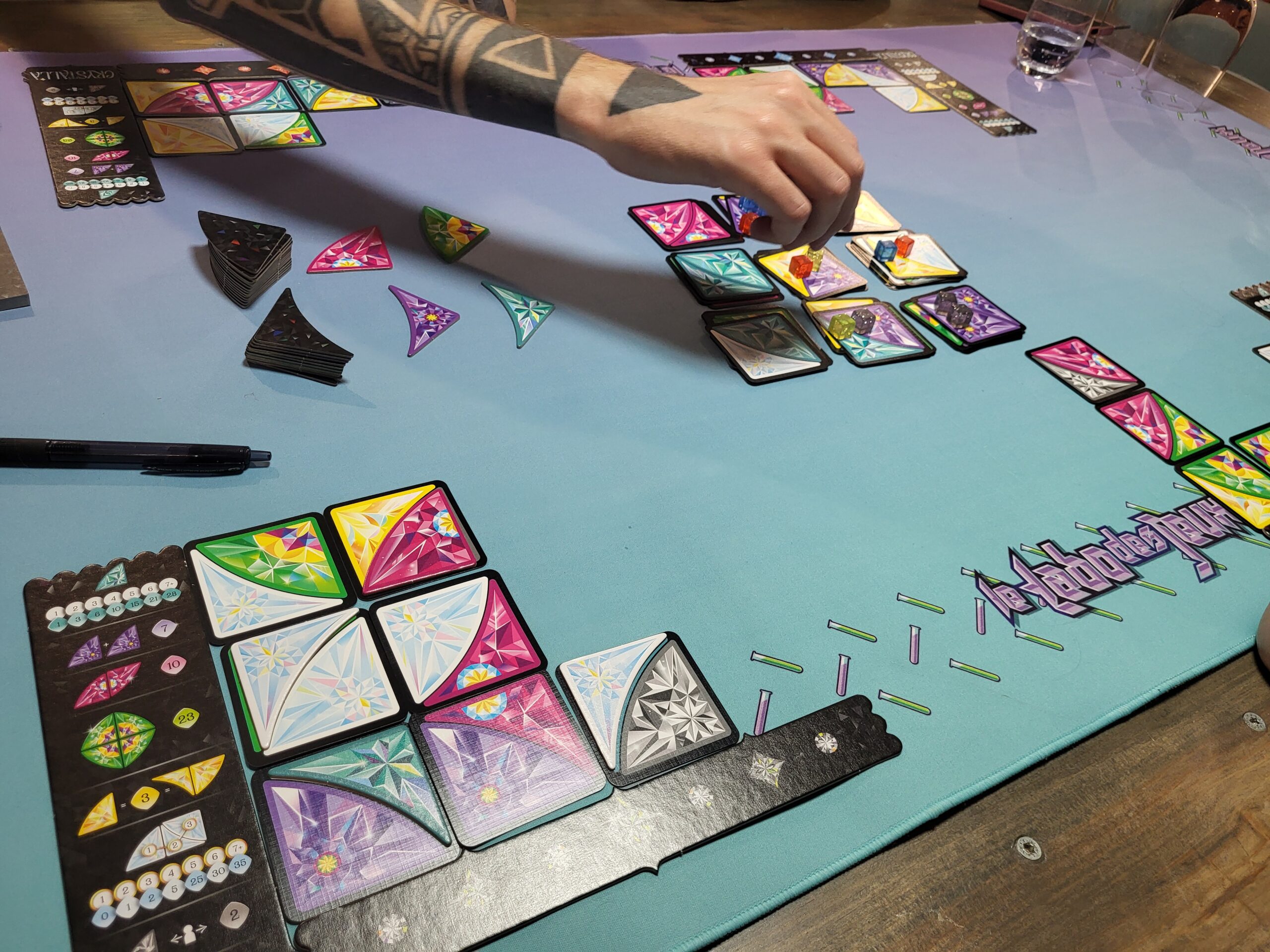 Un joueur n’ayant pas joué à Azul, Patchwork ou un autre pourra y trouver son compte sans souci, le fait est que des jeux sortent tout le temps et depuis pas mal d’années, cela me semble difficile de durer avec si peu de différences, même si cela s’est déjà vu. Crystalla est un jeu abstrait cohérent dans sa proposition et qui vous proposera un challenge de construction de motifs avec neuf cartes à poser devant vous, en essayant d’optimiser au mieux. Et un petit sourire en coin quand vous réussirez à donner une tuile qui embête particulièrement votre adversaire.