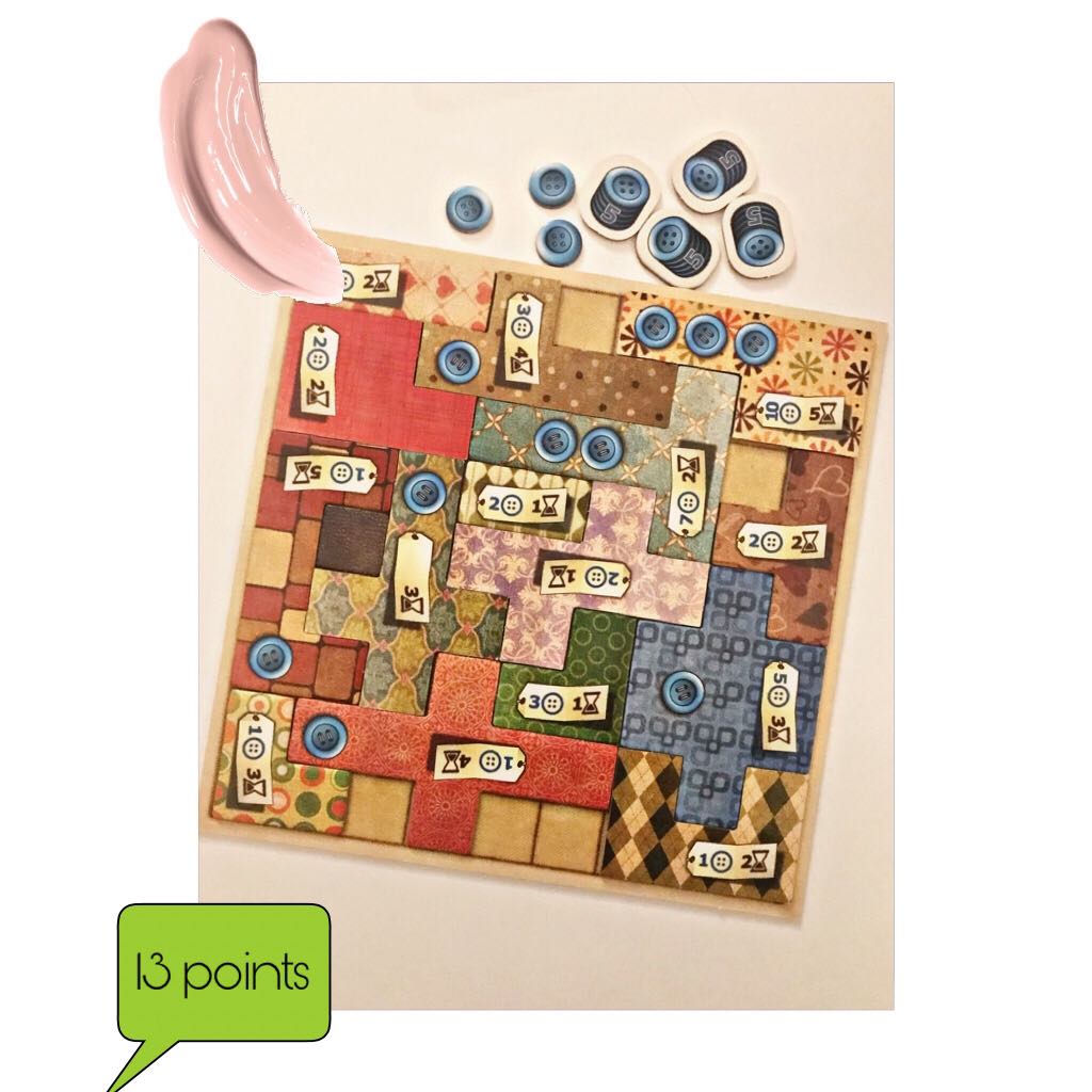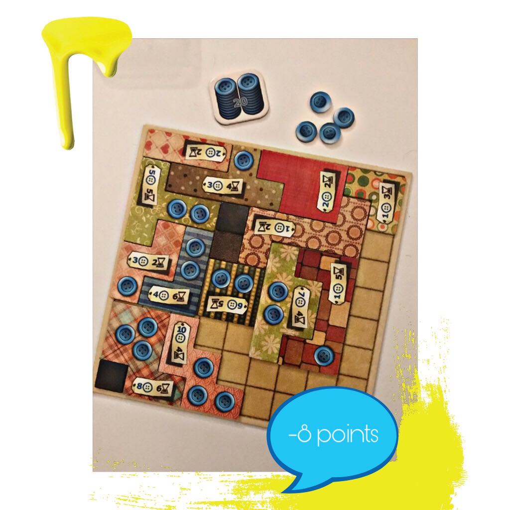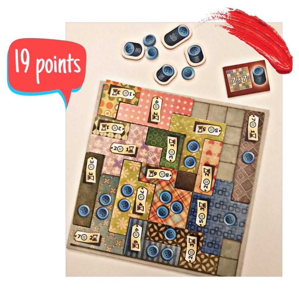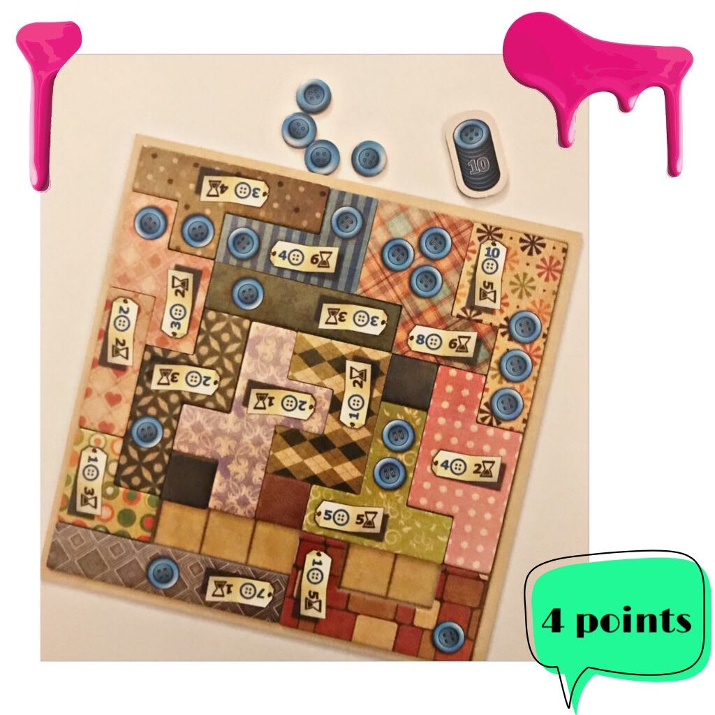 Malgré sa simplicité apparente, il nécessite une bonne dose de réflexion pour voir ce qui sera le plus rentable. Une pièce peut être très attirante mais si elle épuise tous vos Boutons pour le tour suivant, est-ce que cela est finalement intéressant ? Il en va de même pour la gestion du temps. Plus vous faites d’actions, plus vous augmentez vos chances de prendre des pièces et de remplir votre Patchwork. Et donc, c’est autant de points négatifs en moins en fin de partie !