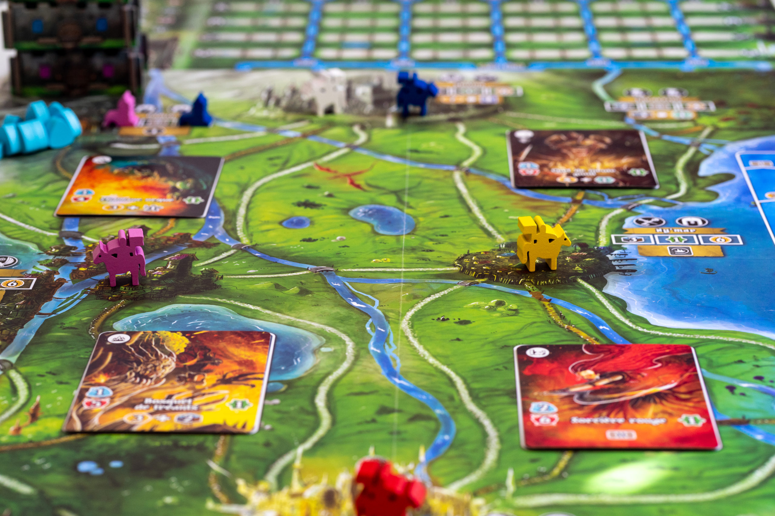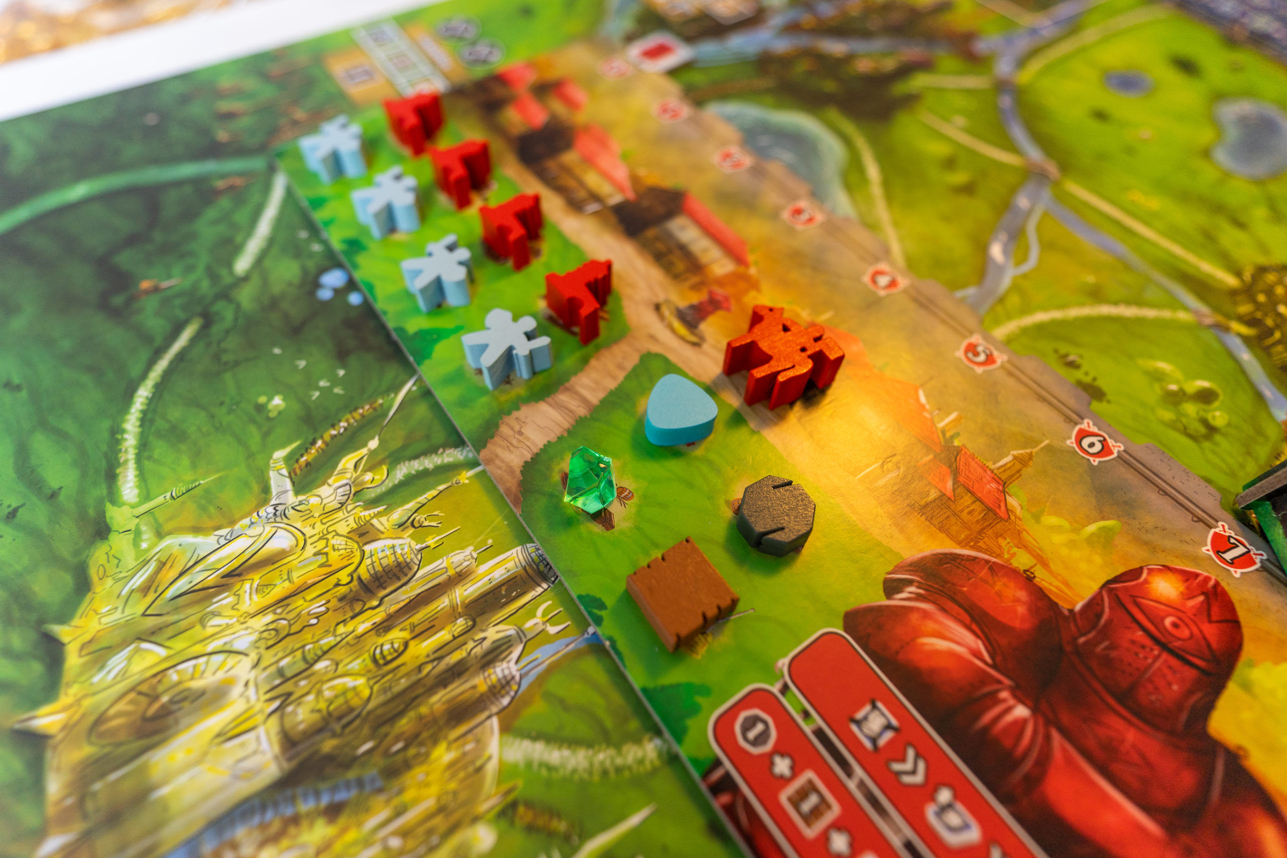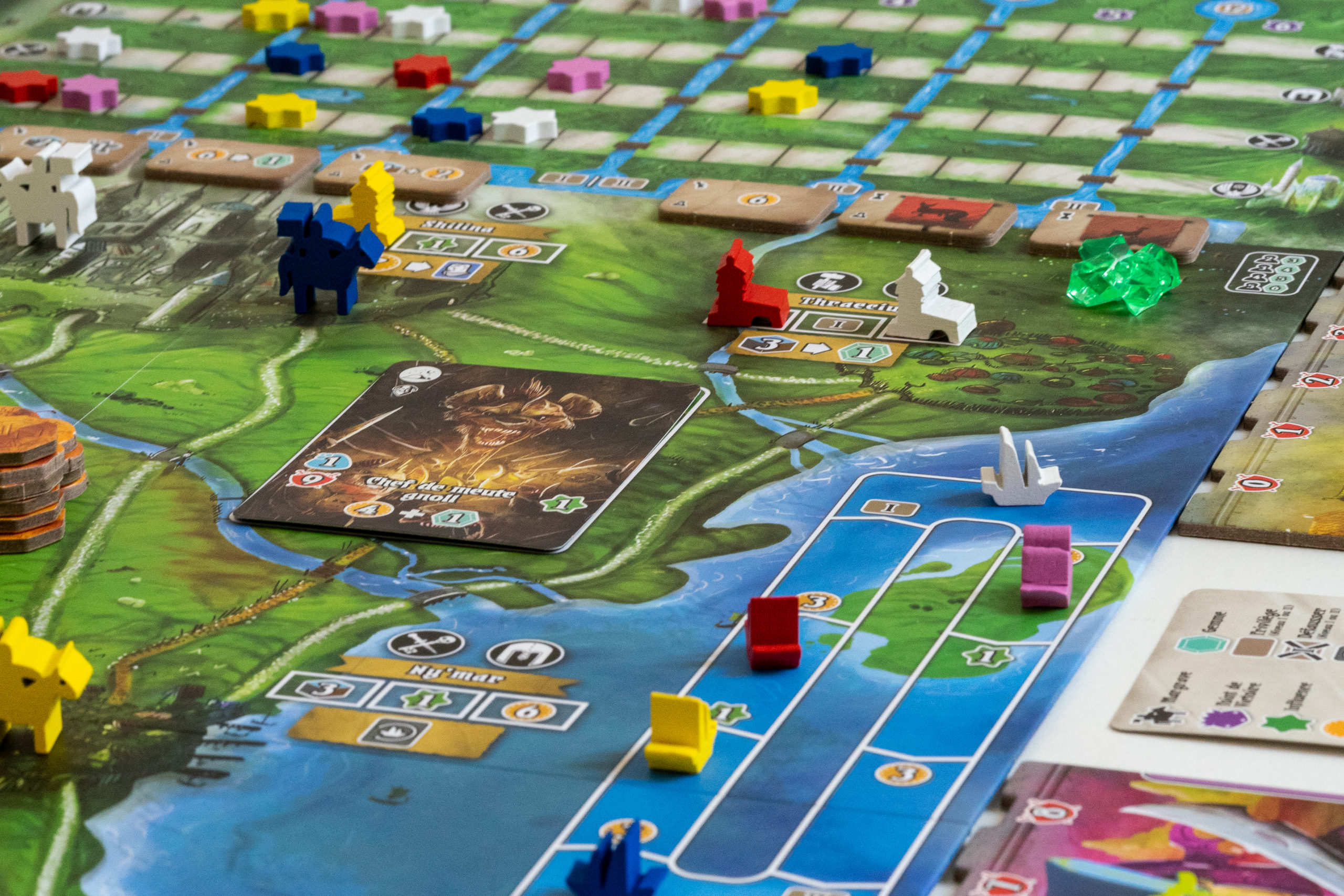 8 lieux sont proposés, chacun avec son pouvoir de lieu différent. En vous déplaçant sur un lieu, vous activerez son pouvoir, avec votre Margrave ou un chevalier. Vous effectuerez des allers-retours sur la carte tout au long de la partie, car à un moment vous aurez besoin de telle ou telle ressource pour construire vos tours, puis d’aller sur un lieu spécifique pour la construire, ou encore d’aller occire un monstre situé à un endroit précis. Encore une fois l’optimisation est de rigueur, et lors de la 1ère partie vous aurez sûrement l’impression de tourner en rond, mais ça fait partie de la courbe d’apprentissage 😉
