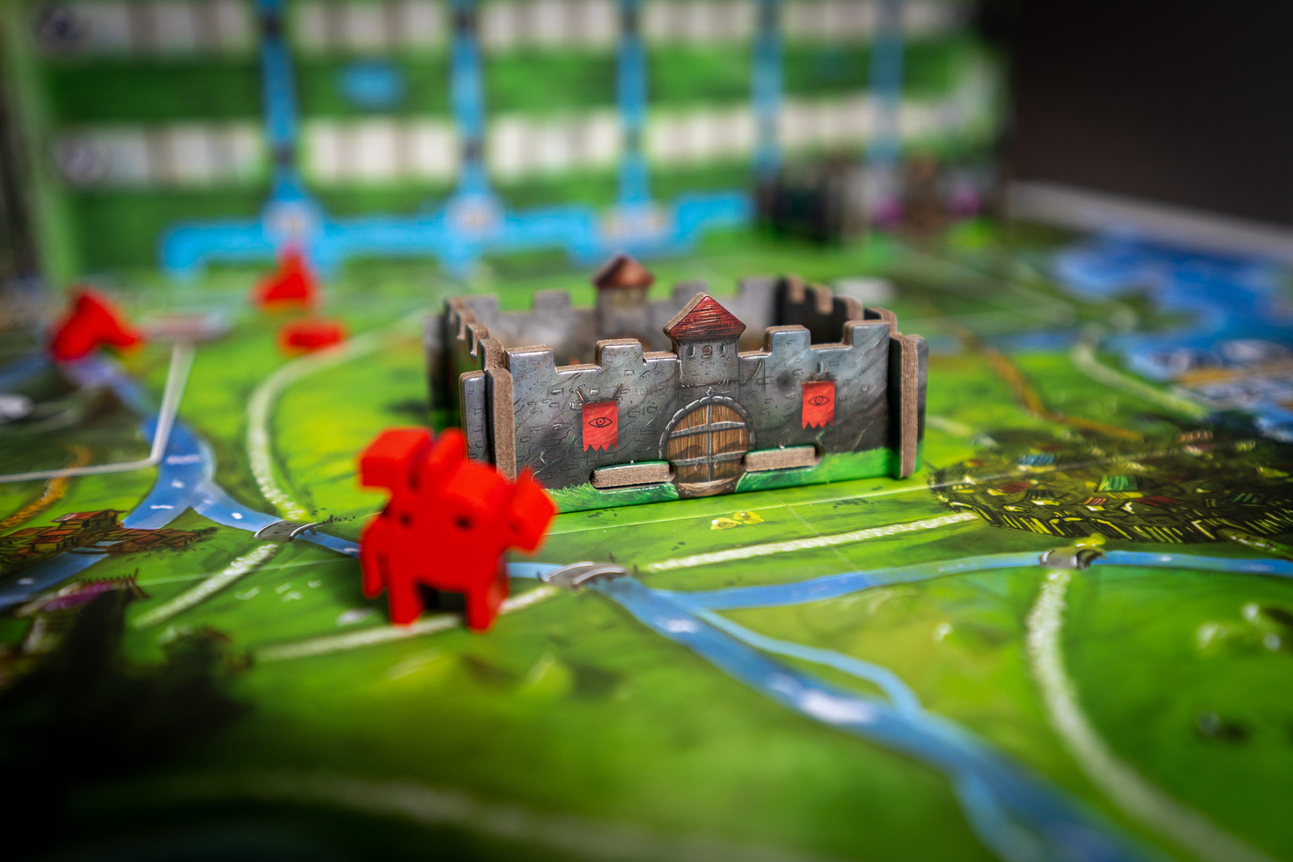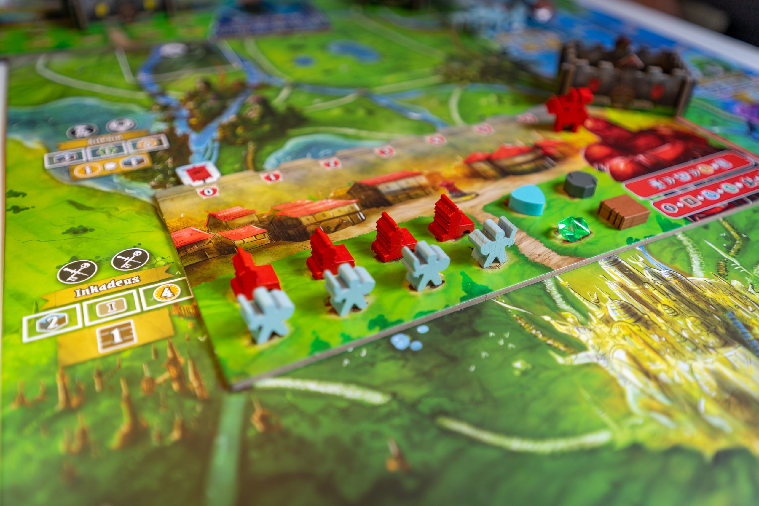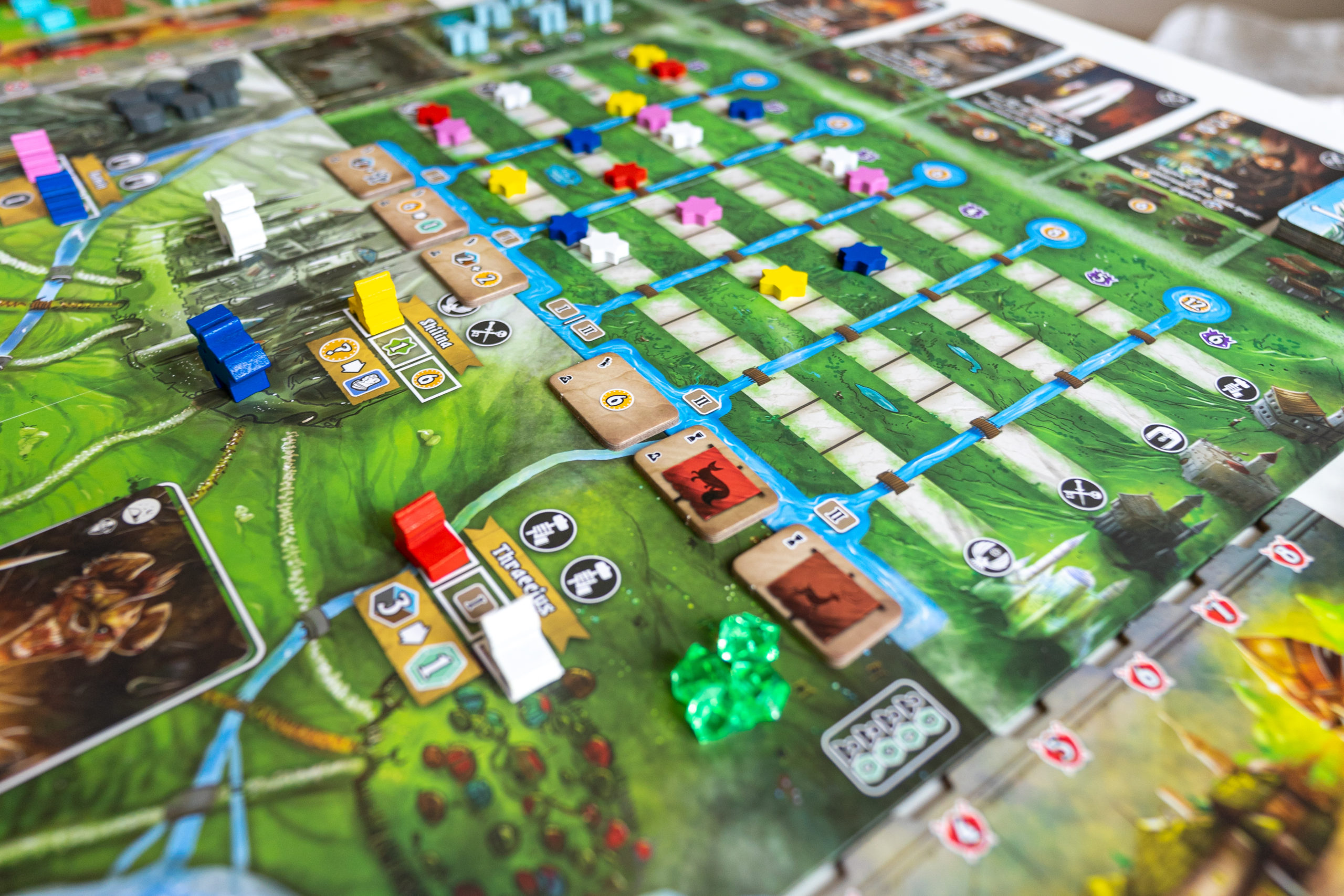 8 lieux sont proposés, chacun avec son pouvoir de lieu différent. En vous déplaçant sur un lieu, vous activerez son pouvoir, avec votre Margrave ou un chevalier. Vous effectuerez des allers-retours sur la carte tout au long de la partie, car à un moment vous aurez besoin de telle ou telle ressource pour construire vos tours, puis d’aller sur un lieu spécifique pour la construire, ou encore d’aller occire un monstre situé à un endroit précis. Encore une fois l’optimisation est de rigueur, et lors de la 1ère partie vous aurez sûrement l’impression de tourner en rond, mais ça fait partie de la courbe d’apprentissage 😉