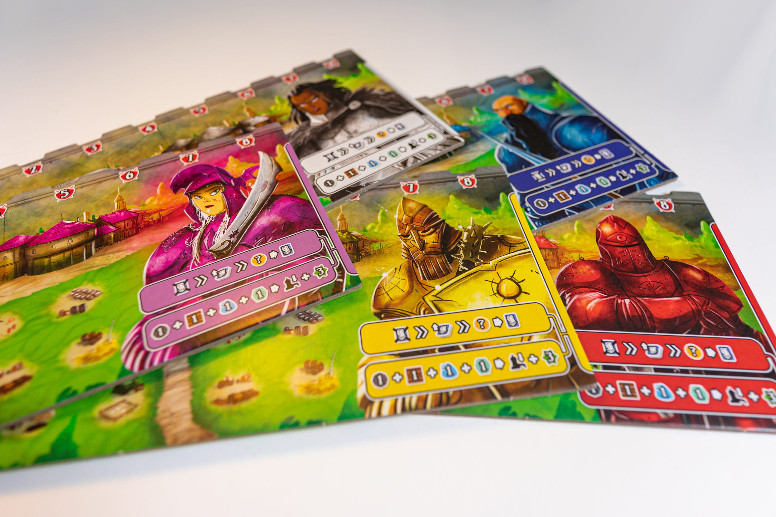 Le plateau comportant les pistes d’influence, la rivière de cartes à acheter, les tuiles bonus et la zone des chevaliers n’est clairement pas à négliger. Vous construirez votre victoire grâce à lui. En gros, et pour que vous ayez l’idée générale, il y a 4 pistes d’influence correspondant aux 4 blasons différents présents dans le jeu. Ces blasons se retrouvent sur les cartes citoyens que vous achetez, les lieux du plateau sur lesquels vous construirez vos tours et les tuiles bonus. Plus vous avancez sur une piste, plus la valeur du blason augmentera. Si vous vous retrouvez avec plusieurs blasons d’un même type, vous aurez tout intérêt à vous concentrer sur cette piste d’influence pour en retirer le maximum de PV en fin de partie !