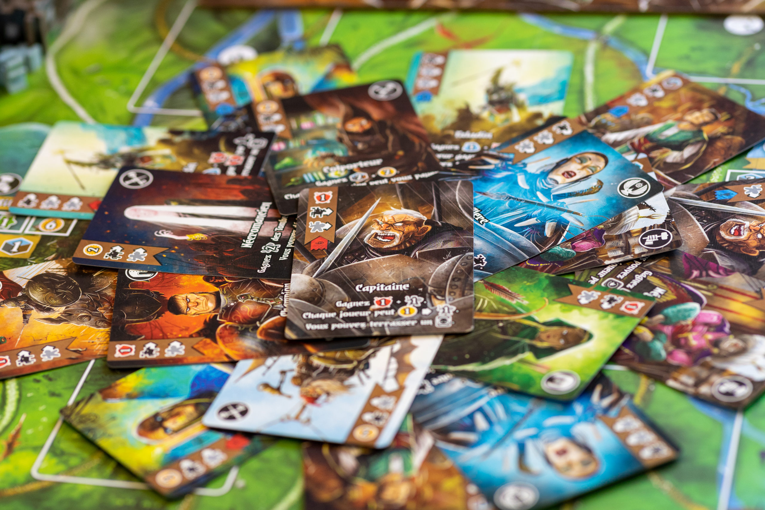 Les cartes achetées sont logiquement plus fortes que celles de la main de départ, et surtout comportent des blasons qui rapporteront des PV en fin de partie.