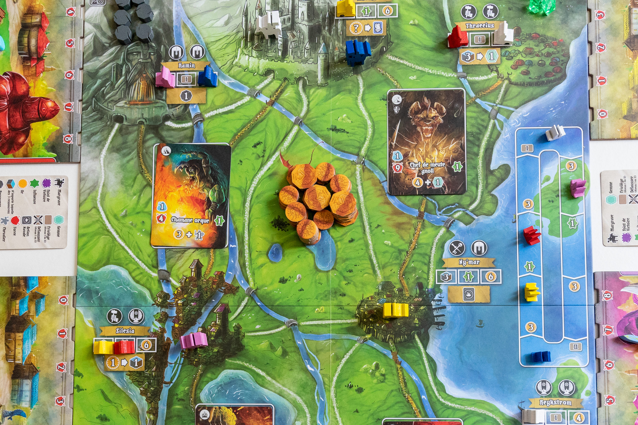 Qui dit placement d’ouvriers dit zones pour accueillir ces ouvriers. Le jeu propose 1 plateau central représentant le monde de Valeria dans lequel vous vous déplacerez avec votre Margrave, le commandant de vos armées. Il y a aussi 1 plateau annexe pour suivre les pistes d’influence, la rivière d’achat de cartes et autres joyeusetés dont le jeu est pourvu.