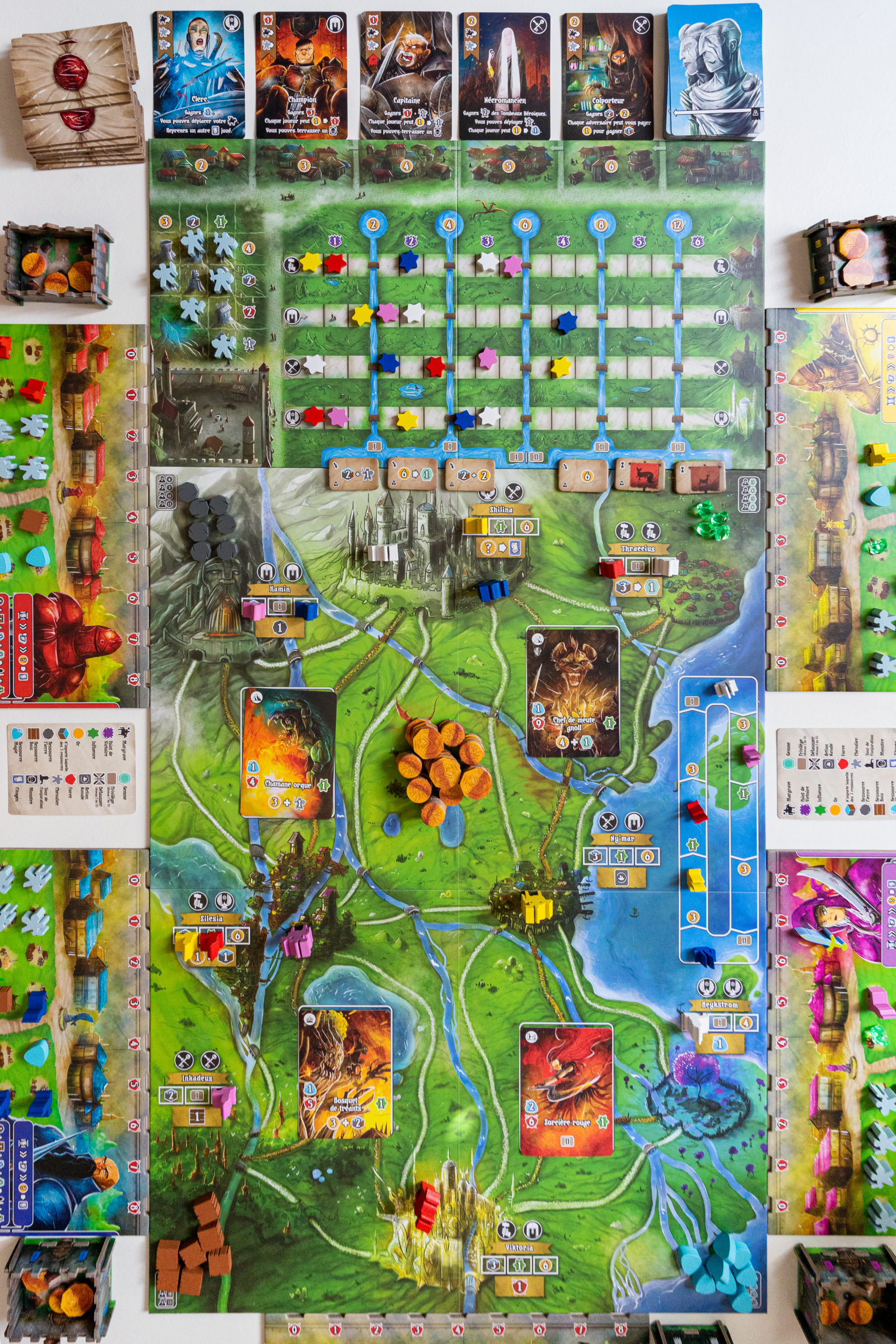 Concrètement, votre plateau individuel est limité au début de la partie. Par exemple, vous ne pouvez accueillir que 3 dés, 1 carte stratagème, 3 cartes champions etc… Au fur et à mesure des stratagèmes validés, et donc des marqueurs conquête que vous enlèverez de votre plateau, vous débloquerez la possibilité d’accueillir par exemple jusque 5 dés, 1 ou 2 cartes stratagèmes supplémentaires, ne plus limiter votre influence etc…